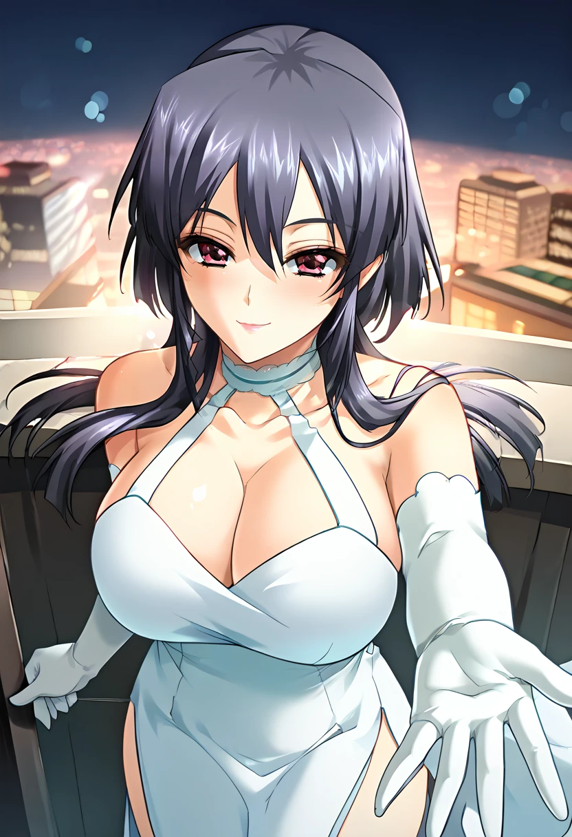 Dress: "white halter dress, side slit, elbow gloves, white gloves"