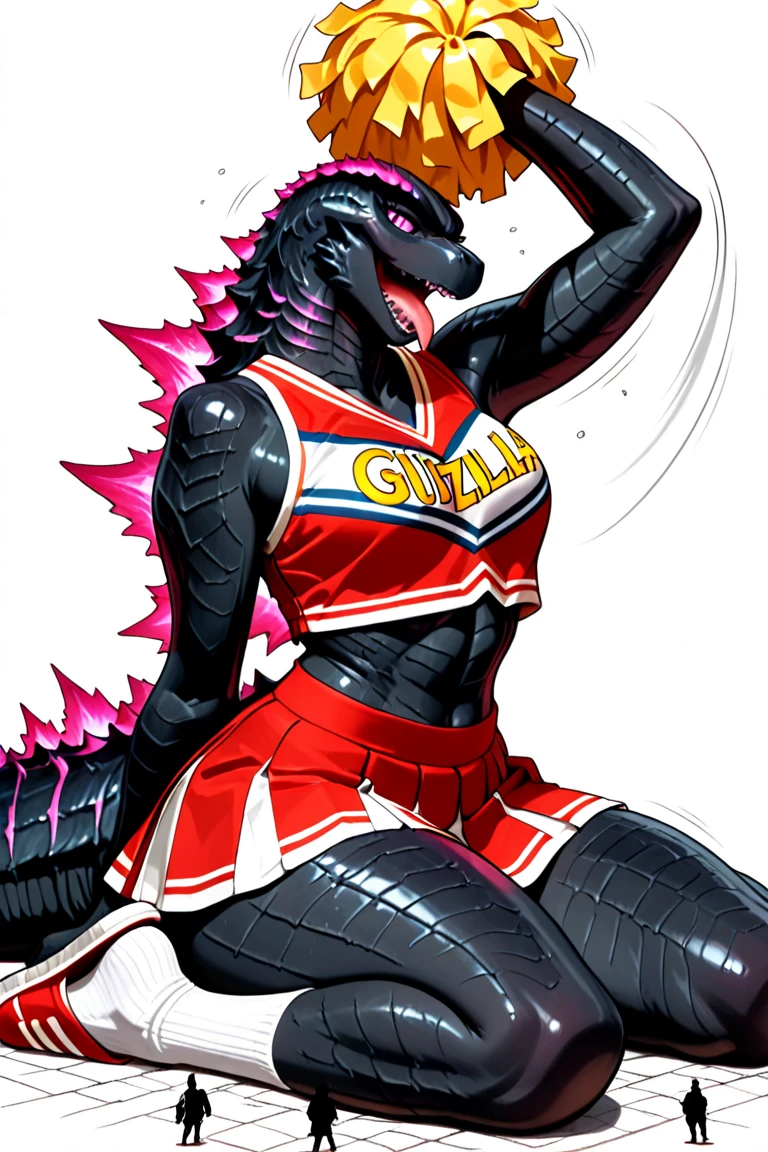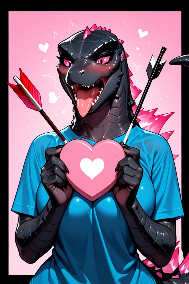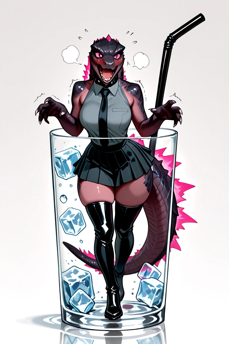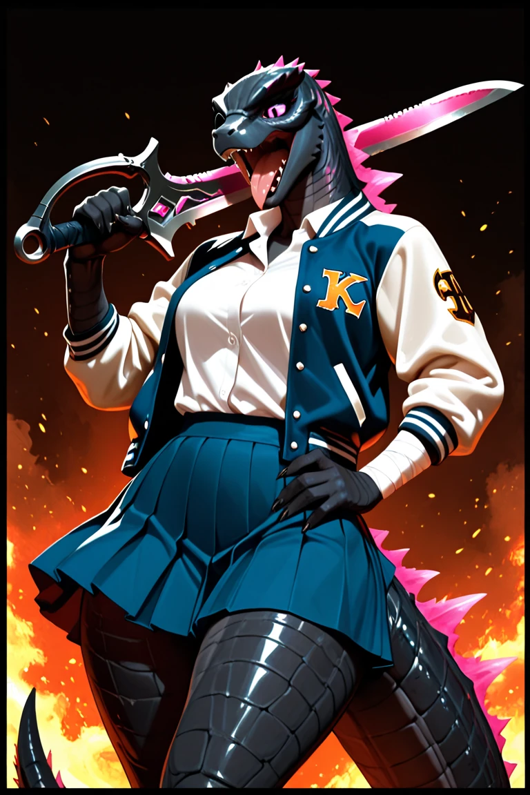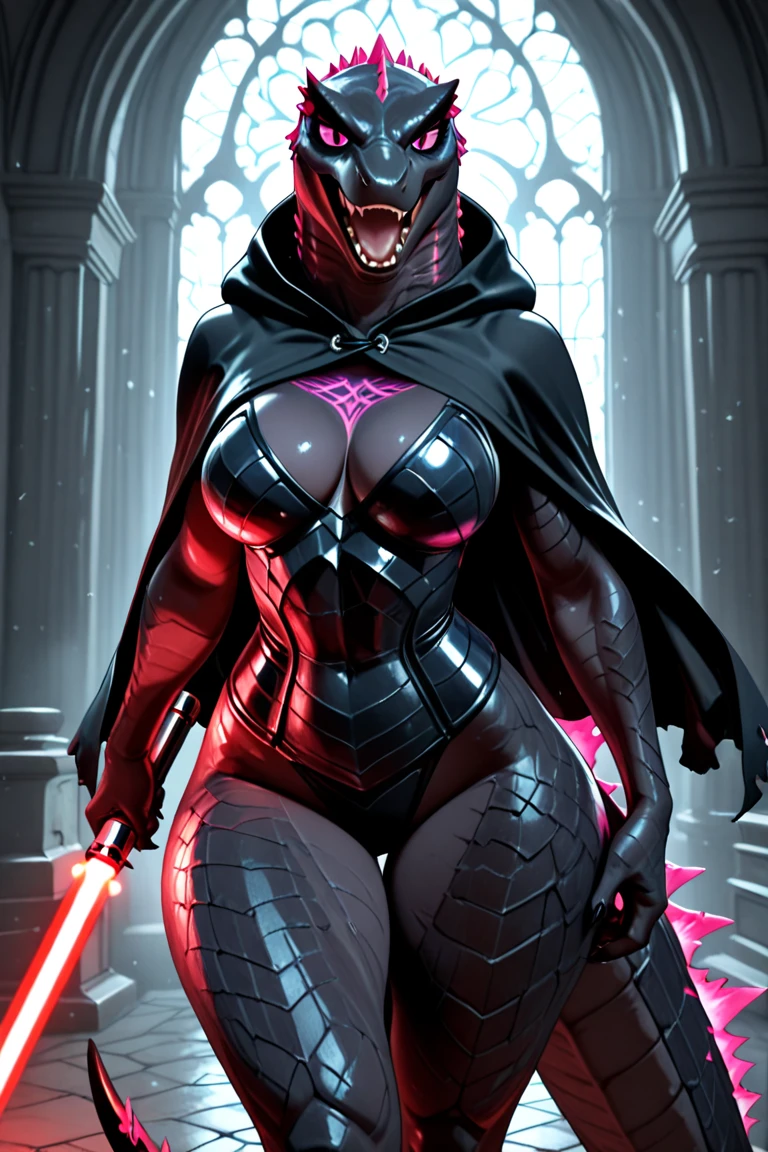 1girl,tail,sharp teeth,tongue,reptilian girl,lizard tail,kaijuu,thick thighs,pink eyes,claws, snout,colored sclera,bright eyes,colored skin,wide hips,black skin