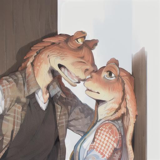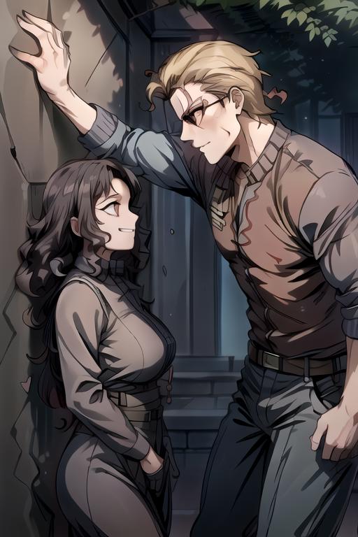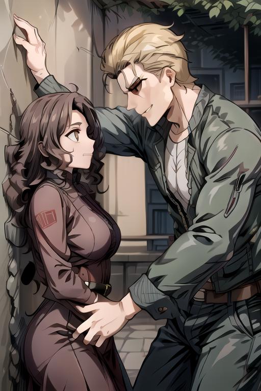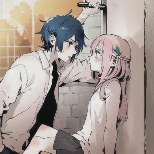 (kabedon, against wall:1.3),blush,couple,looking at another,hetero,height difference,eye contact
