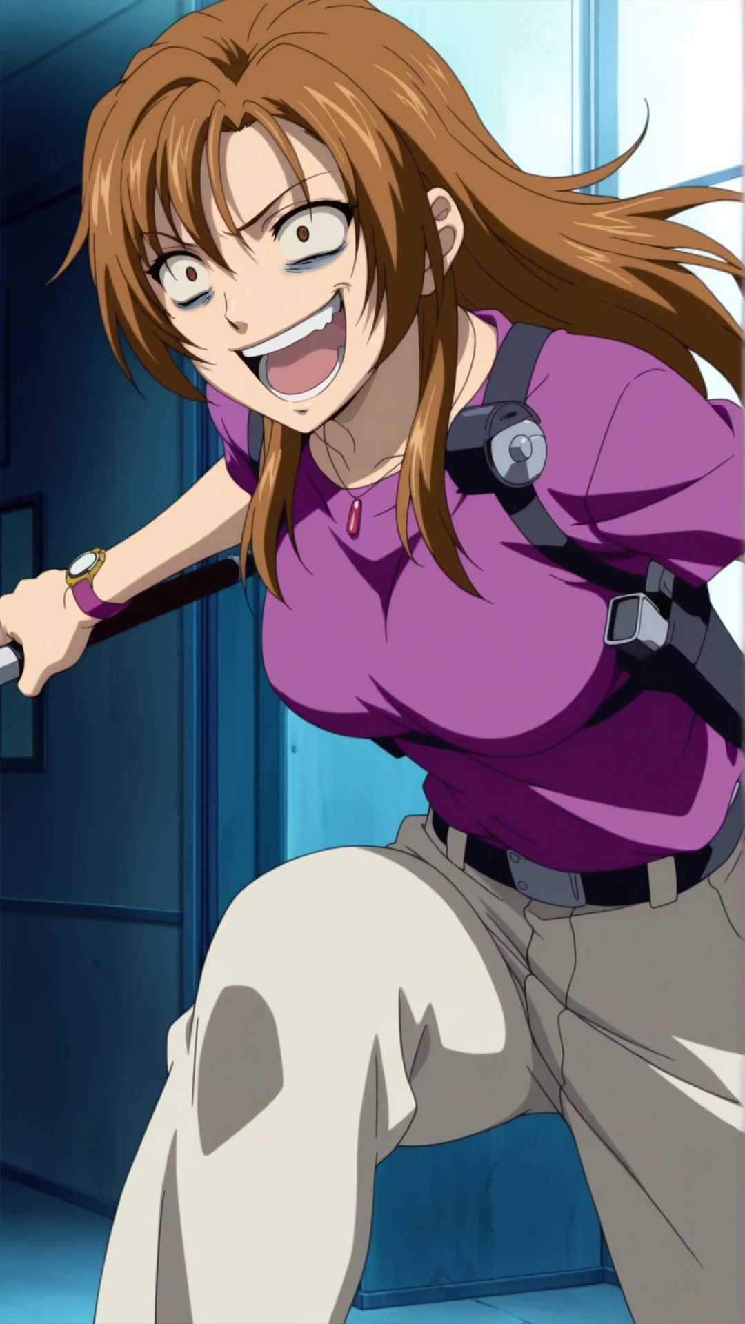 Outfit:shoulder holster, jewelry, wristwatch, breasts, pants, necklace, t-shirt, purple shirt, short sleeves,bags under eyes,
