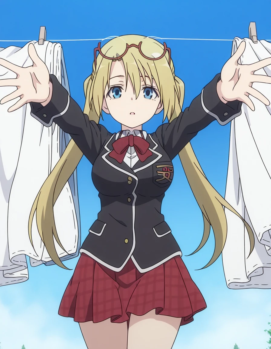 selina sherlock, long hair, blue eyes, blonde hair, twintails, glasses, eyewear on head, mature female, medium breasts, anime screencap