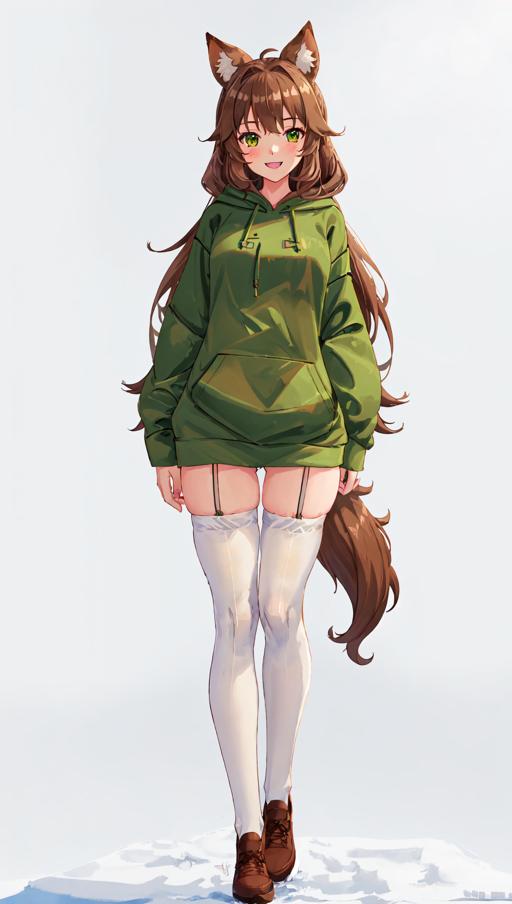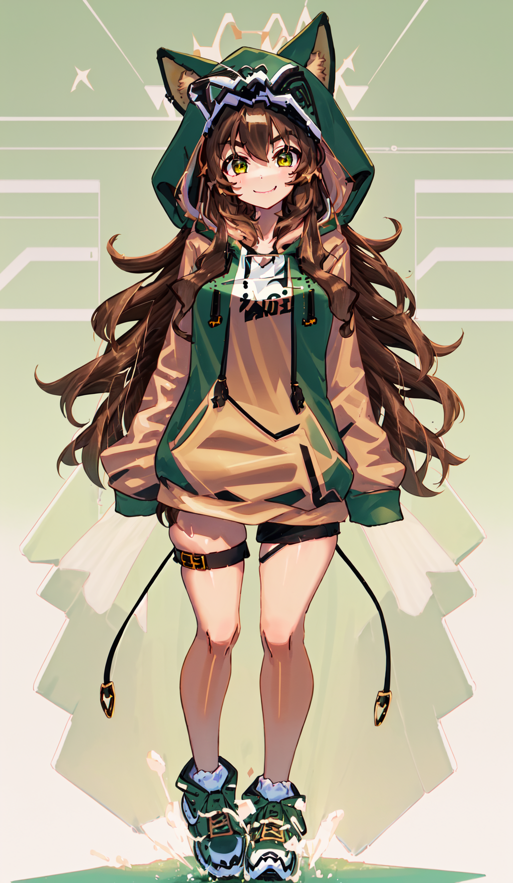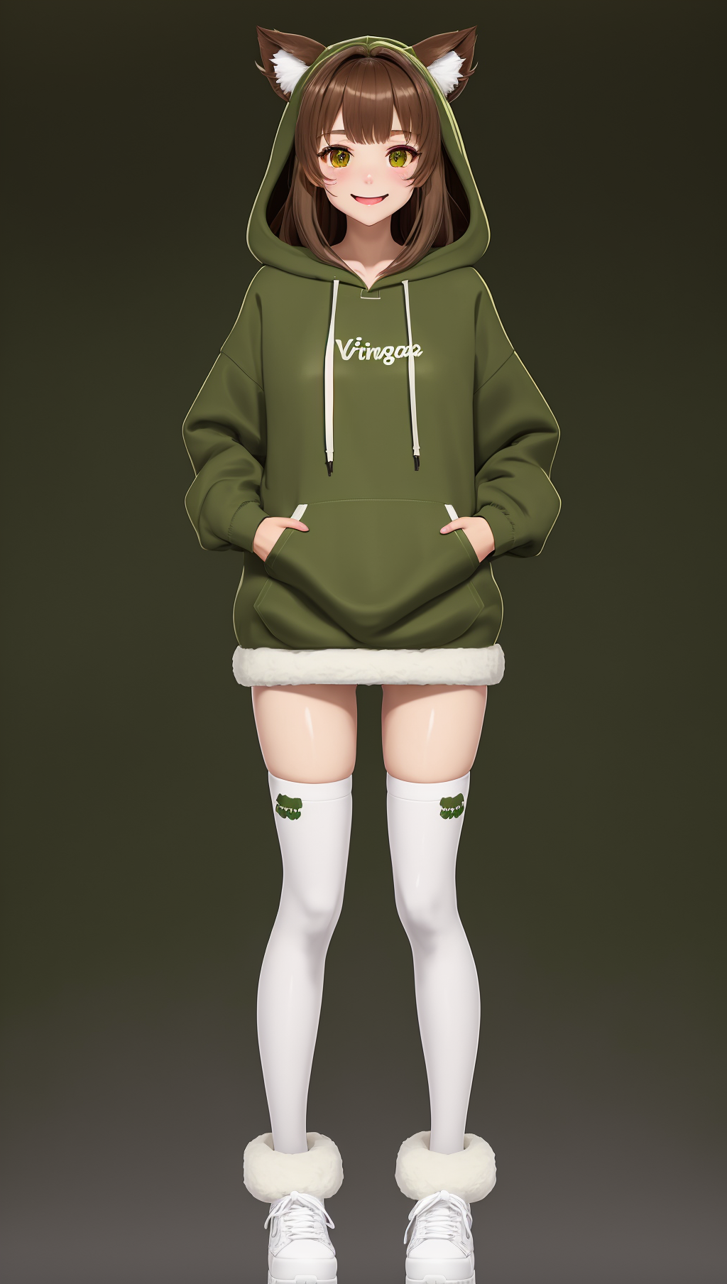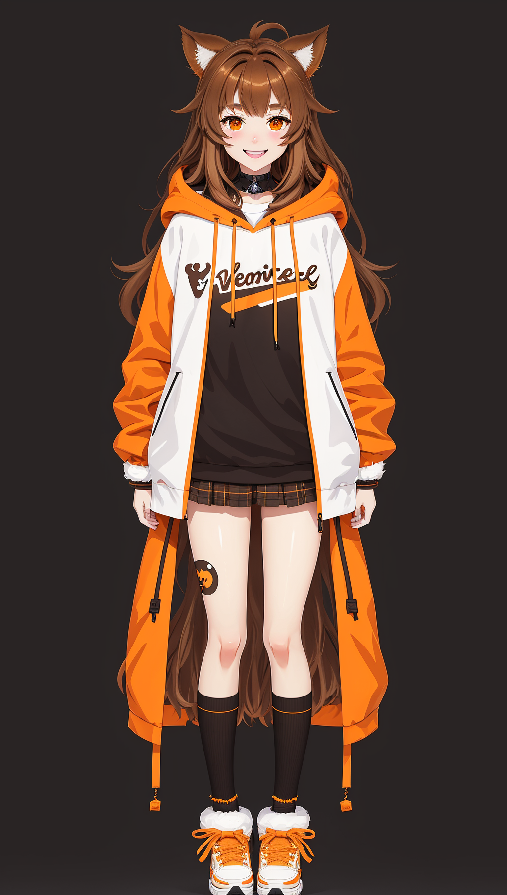 Example prompt: vtubermodel of 1girl , dark brown hair ,orange eyes , fulffy weasel ears , high quality , extra detailed , rendered, (green hoodie:1.3), white background, full body, smiling, semi realism <lora:VtuberMaker:0.7>