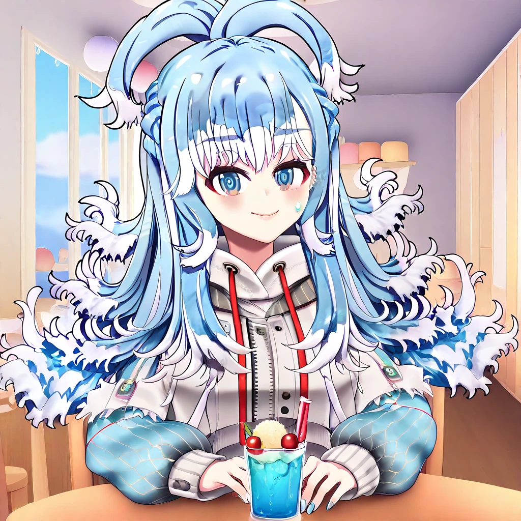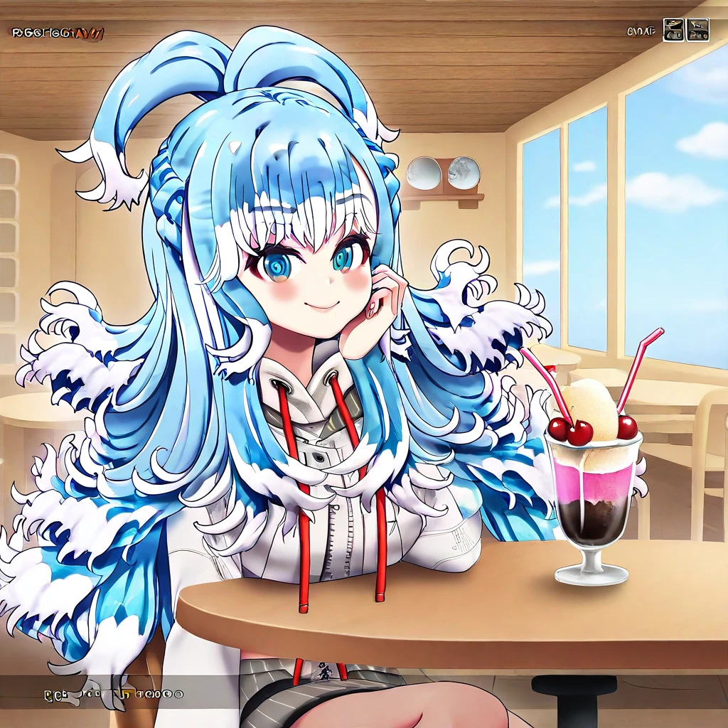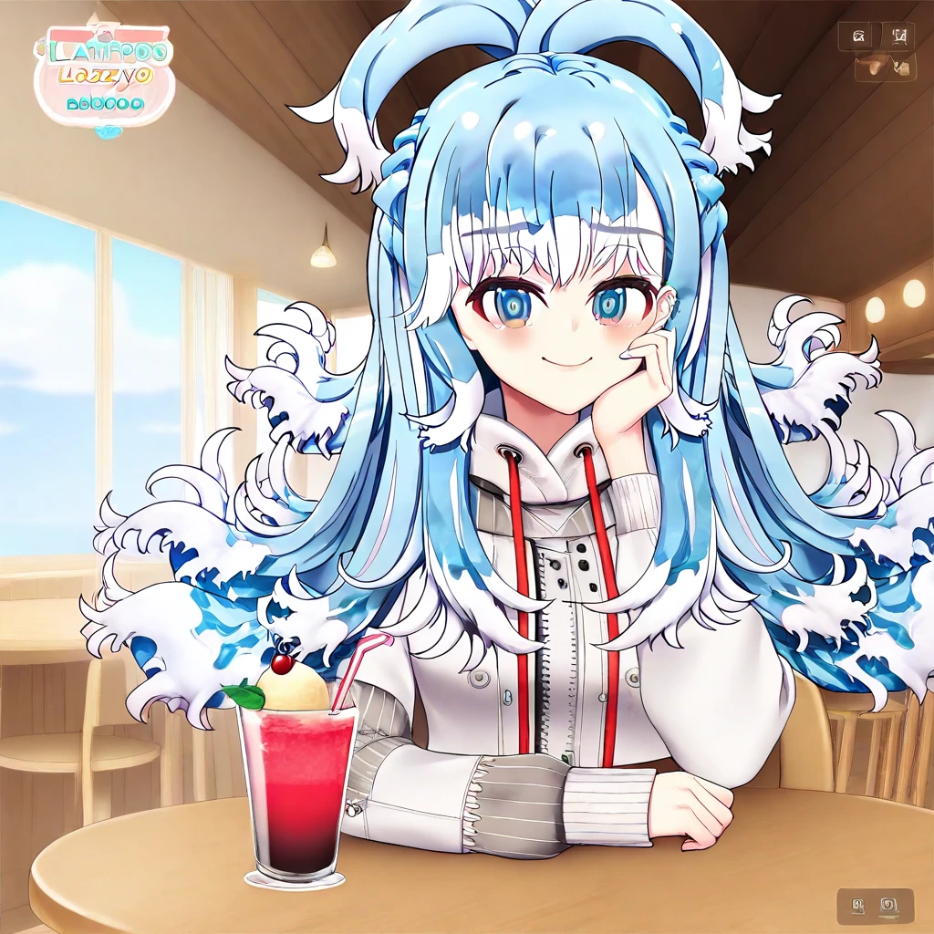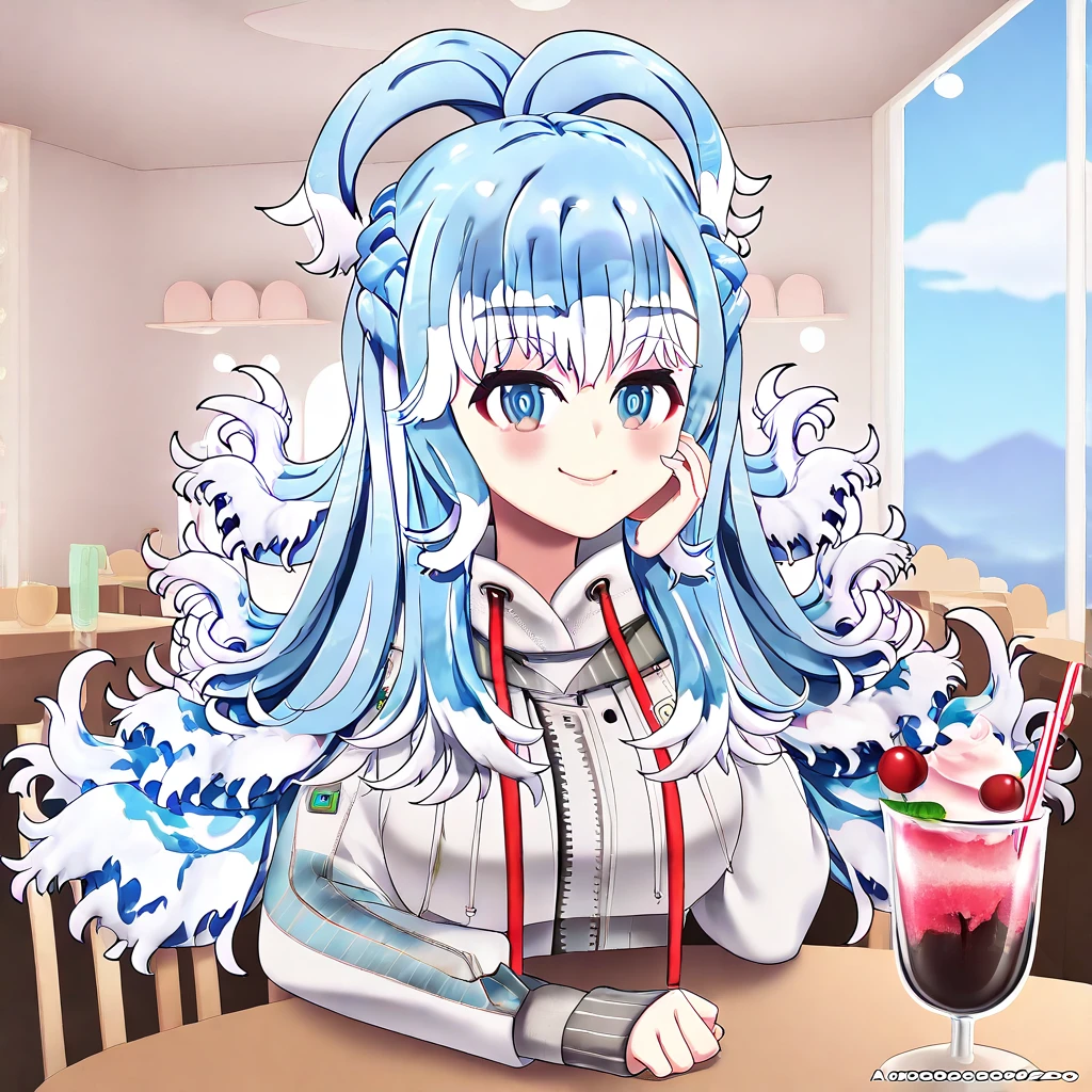KoboKanaeru, blue hair, blue eyes, multicolored hair, white hair, hoodie, hood, large , long hair, virtual youtuber, Smile at viewer, bow, 1girl, solo, lazypos, anime-style, anime screenshot, high quality, lazypos, lazyhand