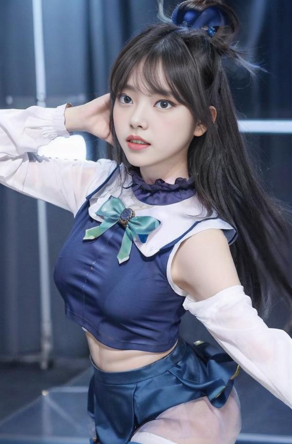 Default Outfit: blue shirt, bow, detached sleeves, skirt, thighhighs, bare shoulders