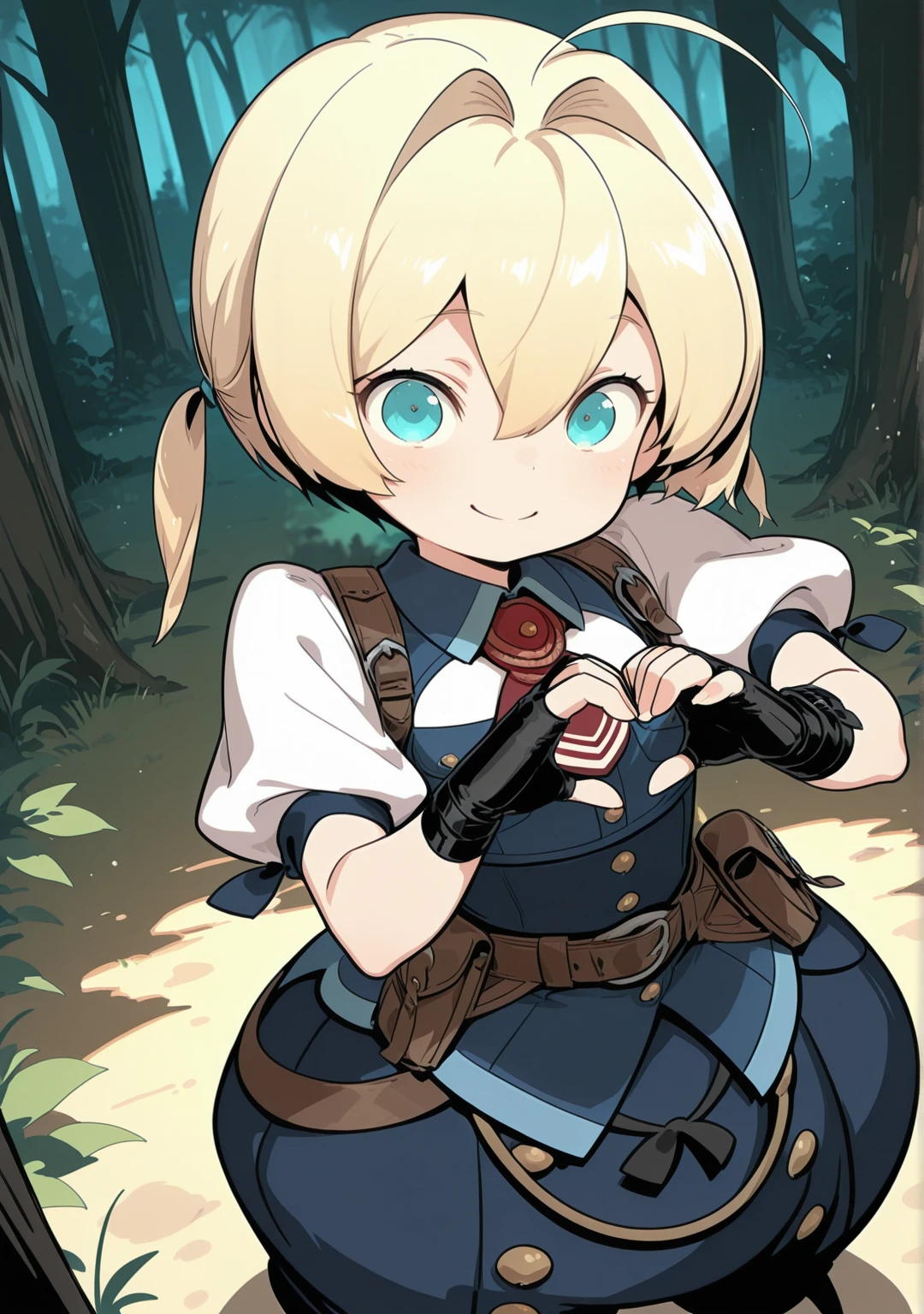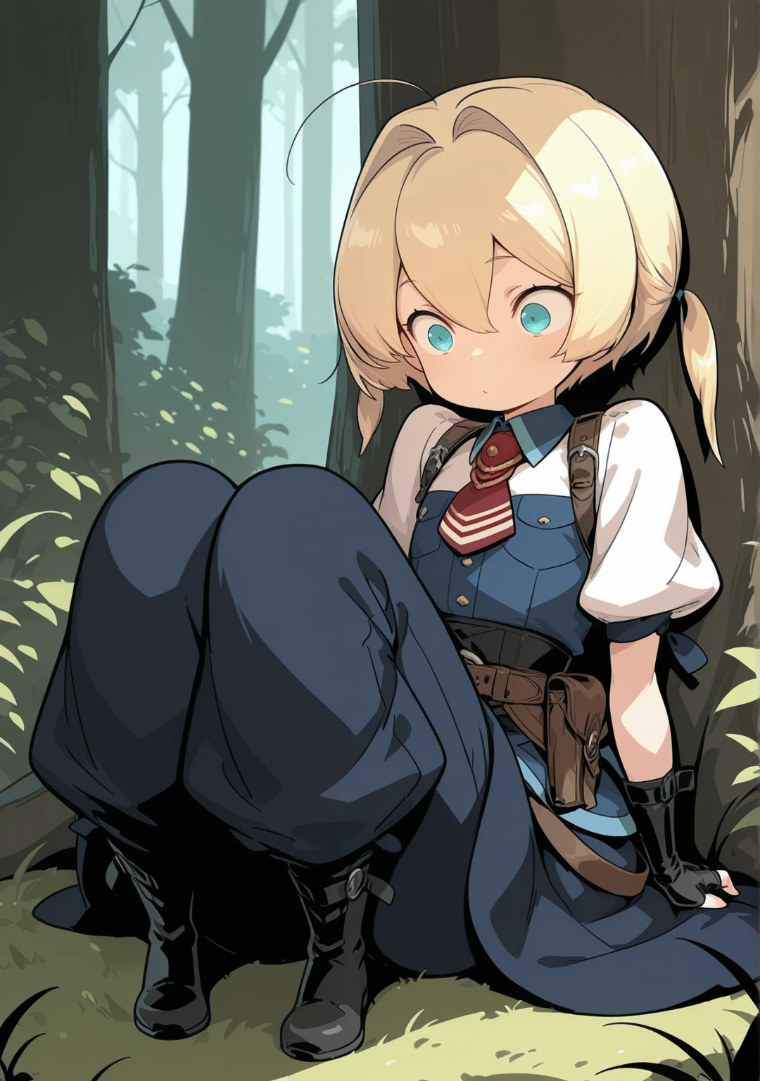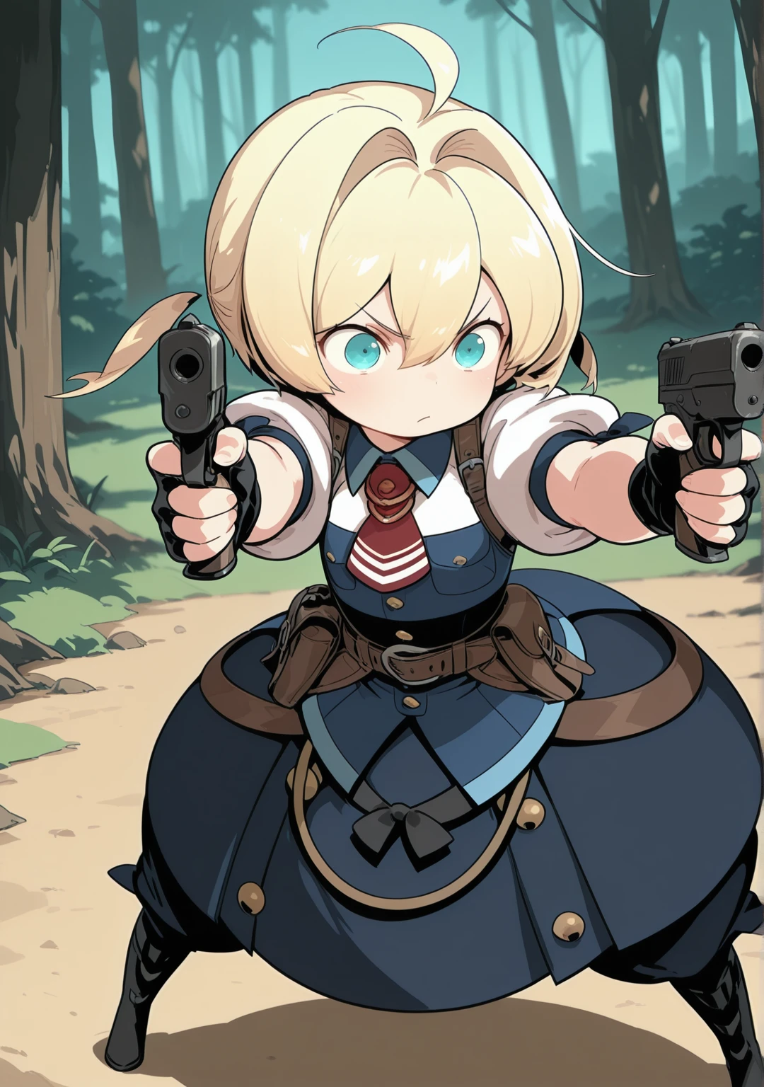 recommend:blonde hair,blue eyes,aqua eyes,ahoge,brown belt,black footwear,hair between eyes,black gloves,hair intakes,puffy pants,blue vest,belt buckle,belt pouch,collared shirt,boots,corset,dress,fingerless gloves,holster,pouch,puffy short sleeves,red ascot,red necktie,short hair,short necktie,short sleeves,short twintails,skirt,white shirt,long skirt,baggy pants,pants under skirt,