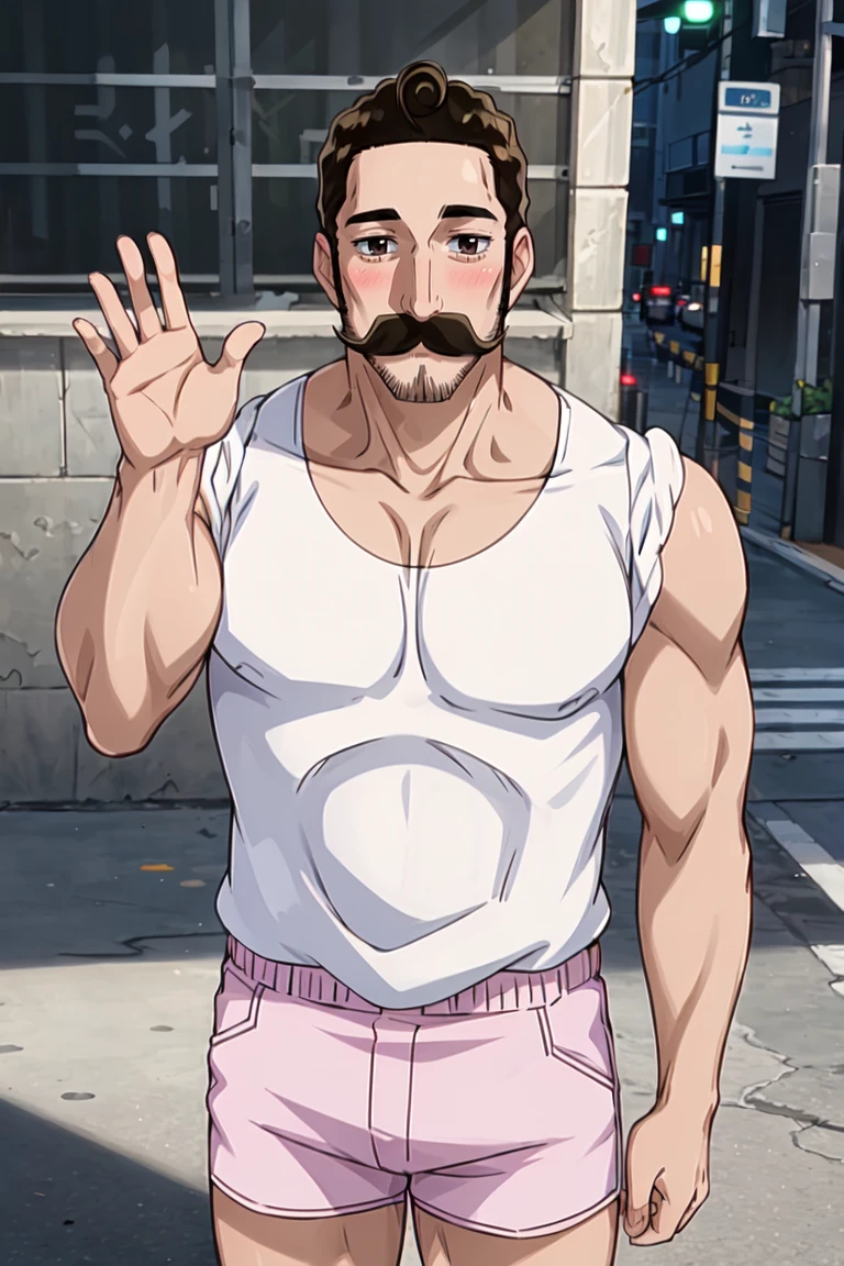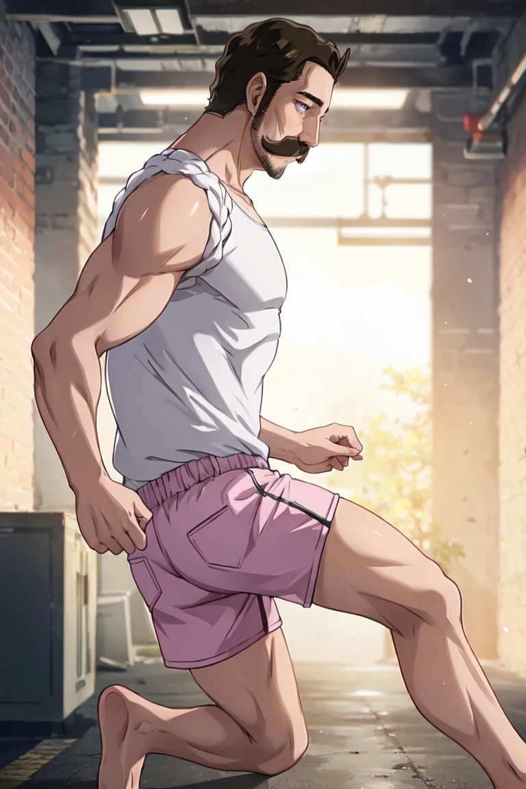 alaindelon, mustache, facial hair, muscular, white tank top, pink shorts