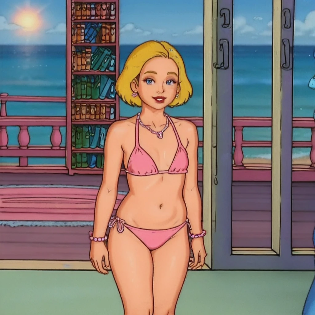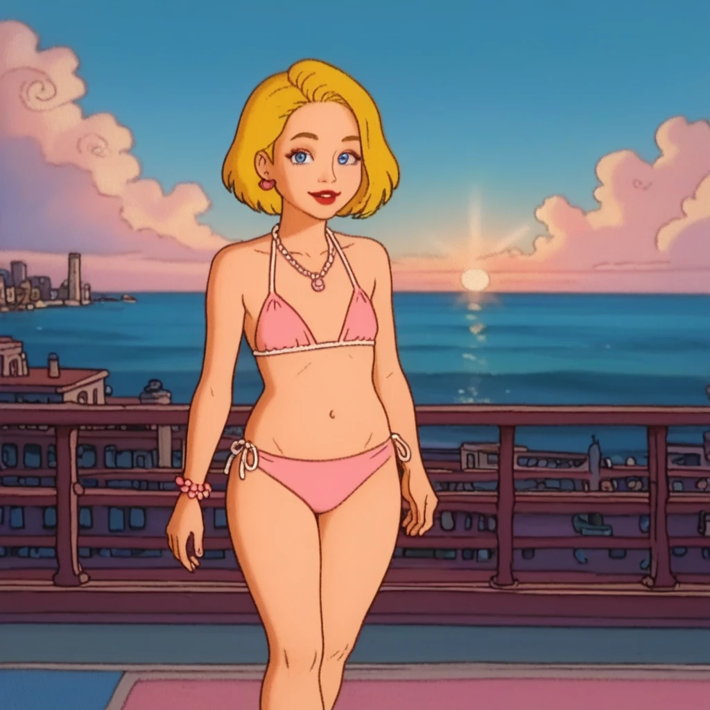 Medium Woman, Medium Height, Blonde Hair, Medium Hair, Parted Bangs, Blonde Eyebrows, Blue Eyes, Sharp Eyeliner, Eyelashes, Outlined Iris, Ombre, Detailed Eyes:1, Makeup, Red Lipstick, D-Size Breasts, Large Breasts
