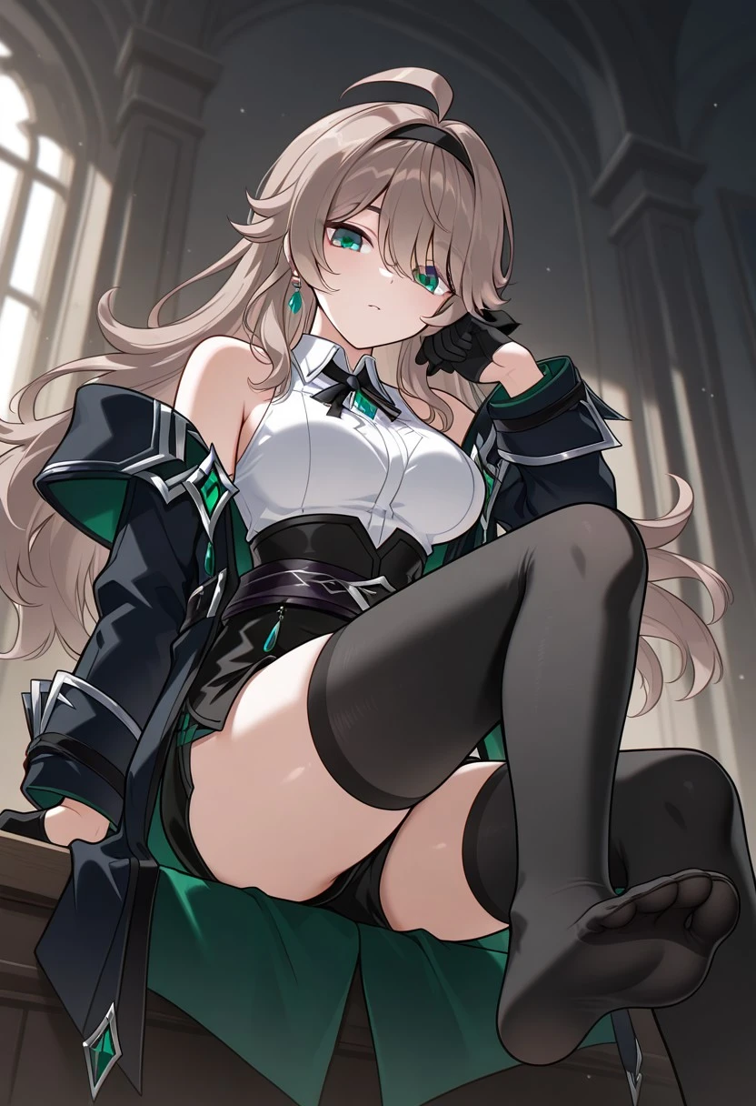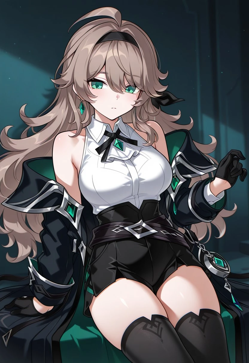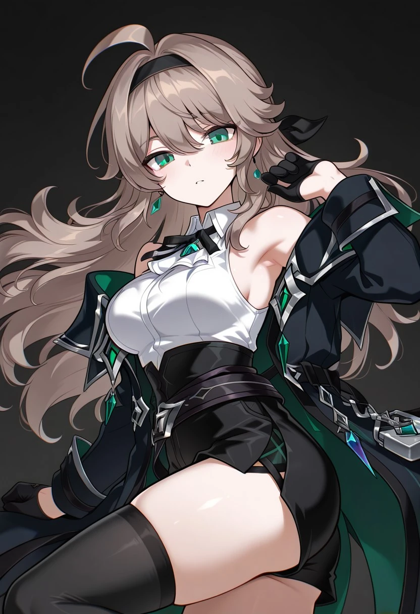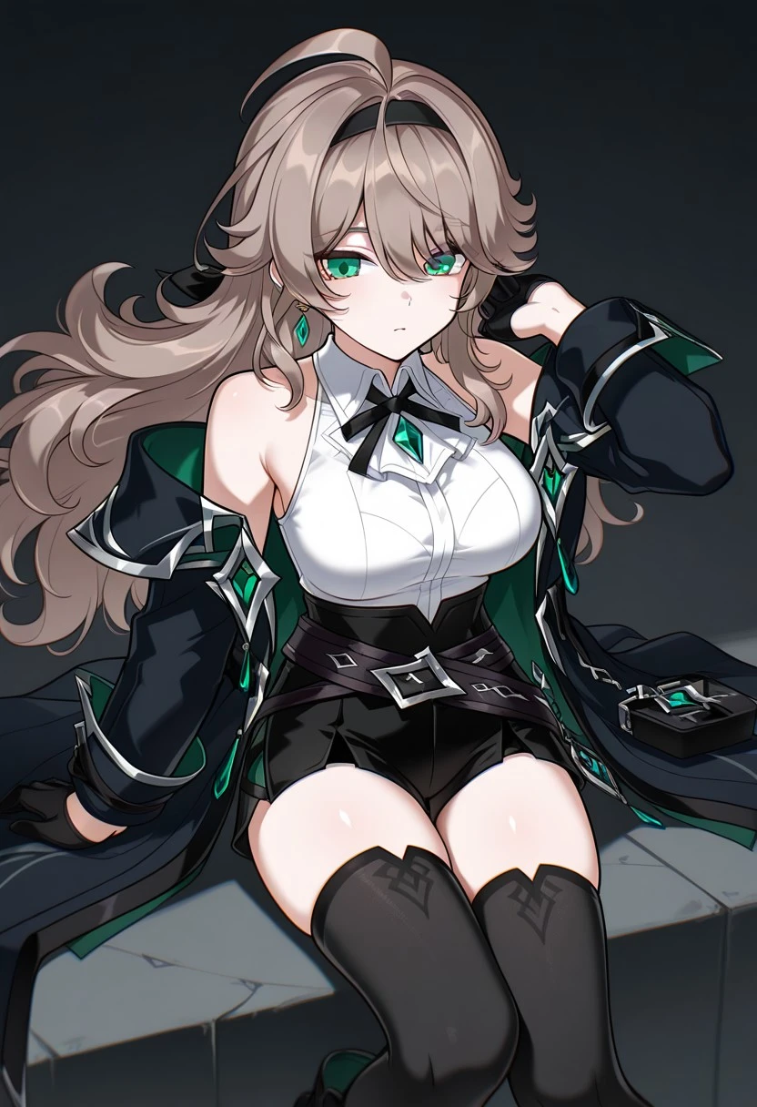 1girl, LithiaRC, ahoge, brown hair, very long hair, green eyes, black hairband, black ribbon, green gem earrings, earrings, collared shirt, sleeveless shirt, black neck ribbon, bare shoulders, LithiaRC coat, off-shoulder coat, black coat, black sleeve cuffs, black gloves, half gloves, high-waist shorts, black shorts, black crossed belts, black belts, LithiaRC thighhighs, thighhighs, black bootsLithia - Achlys