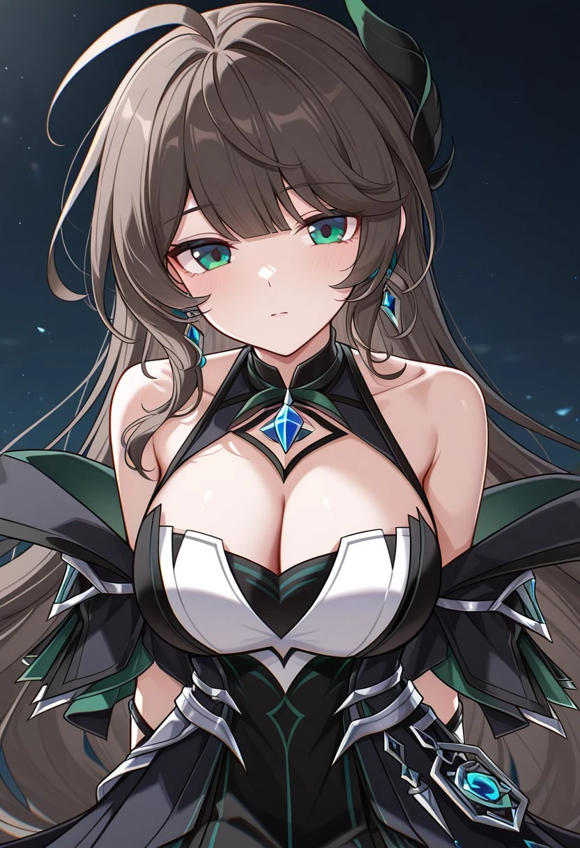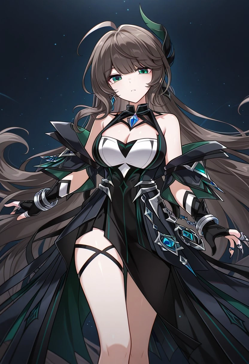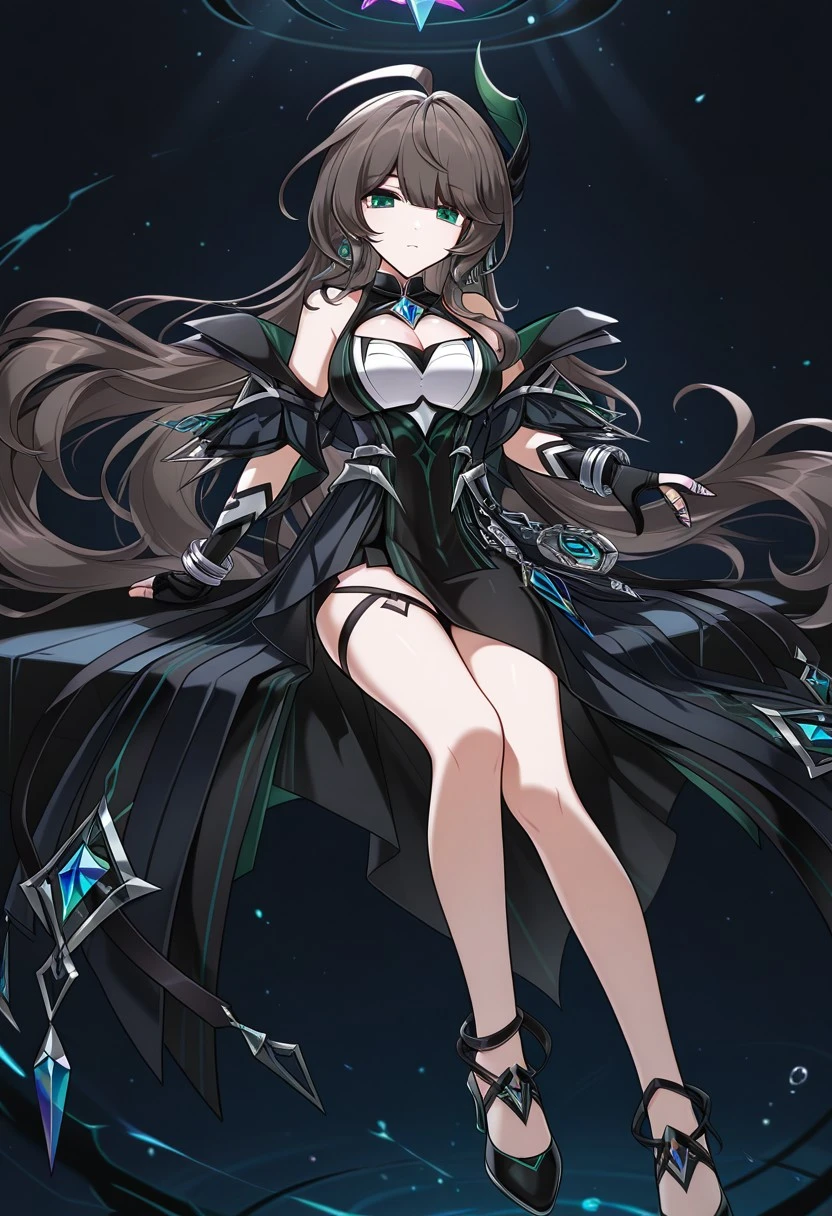 1girl, LithiaAchlys, ahoge, dark brown hair, absurdly long hair, green eyes, LithiaAchlys hair ornament, feather hair ornament, hair ornament, blue gem earrings, earrings, LithiaAchlys dress, sleeveless dress, black dress, cleavage cutout, cleavage, pendant choker, blue gem, sleeveless dress, side slit, cleavage cutout, bare shoulders, detached sleeves, off shoulder, partially fingerless gloves, black gloves, silver bracelet, silver rings, claw ring, jewelry, thigh strap, black high heels, high heels,Extras
