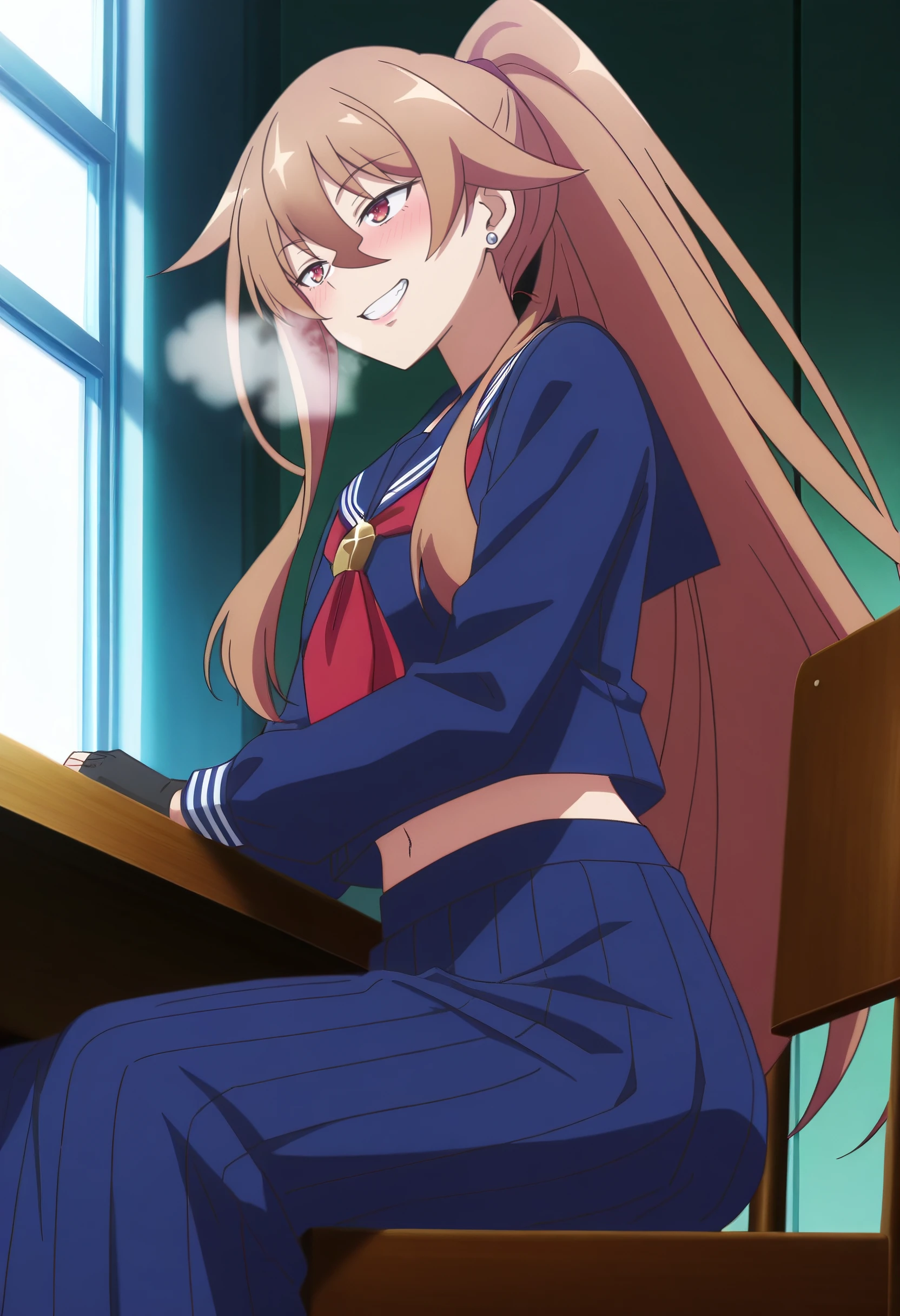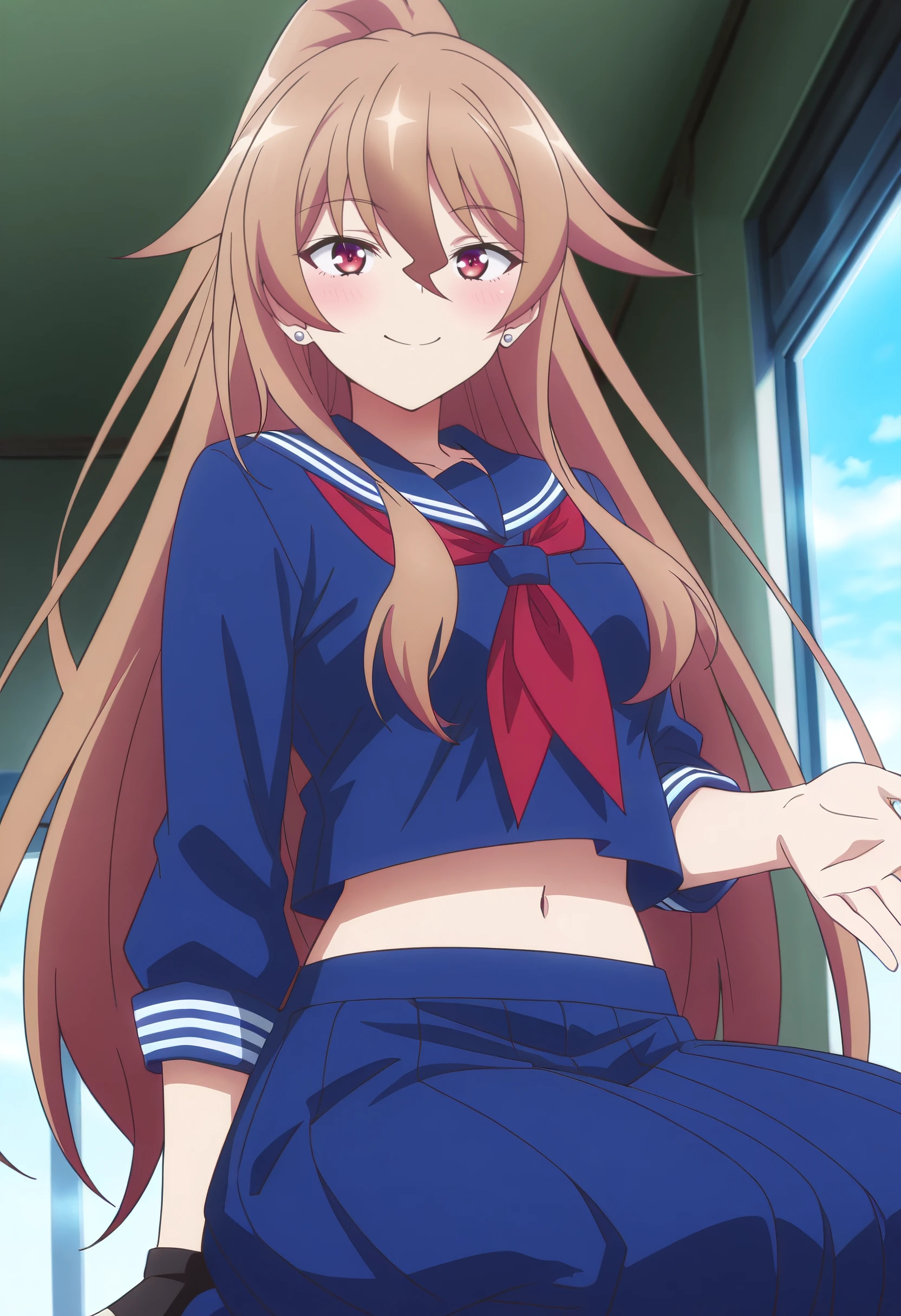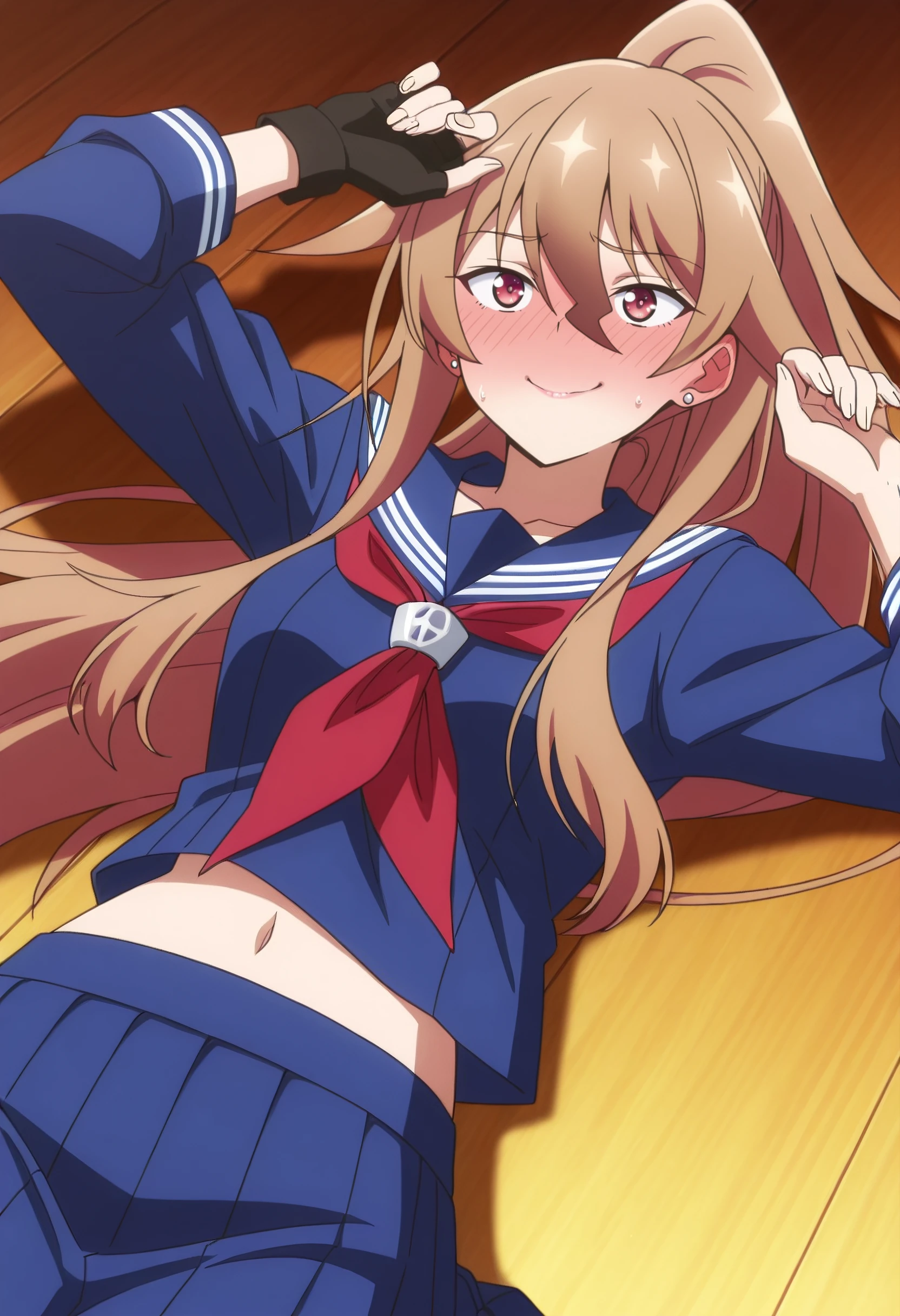 HulemySchool, school uniform, serafuku, ponytail, sailor collar, red neckerchief, neckerchief, skirt, pleated skirt, long sleeves, blue skirt, blue serafuku, shirt, blue sailor collar, long skirt, midriff, high ponytail, gloves, fingerless gloves, black gloves, earrings, jewelry, single glove, asymmetrical gloves, stud earrings, midriff peek, navel,