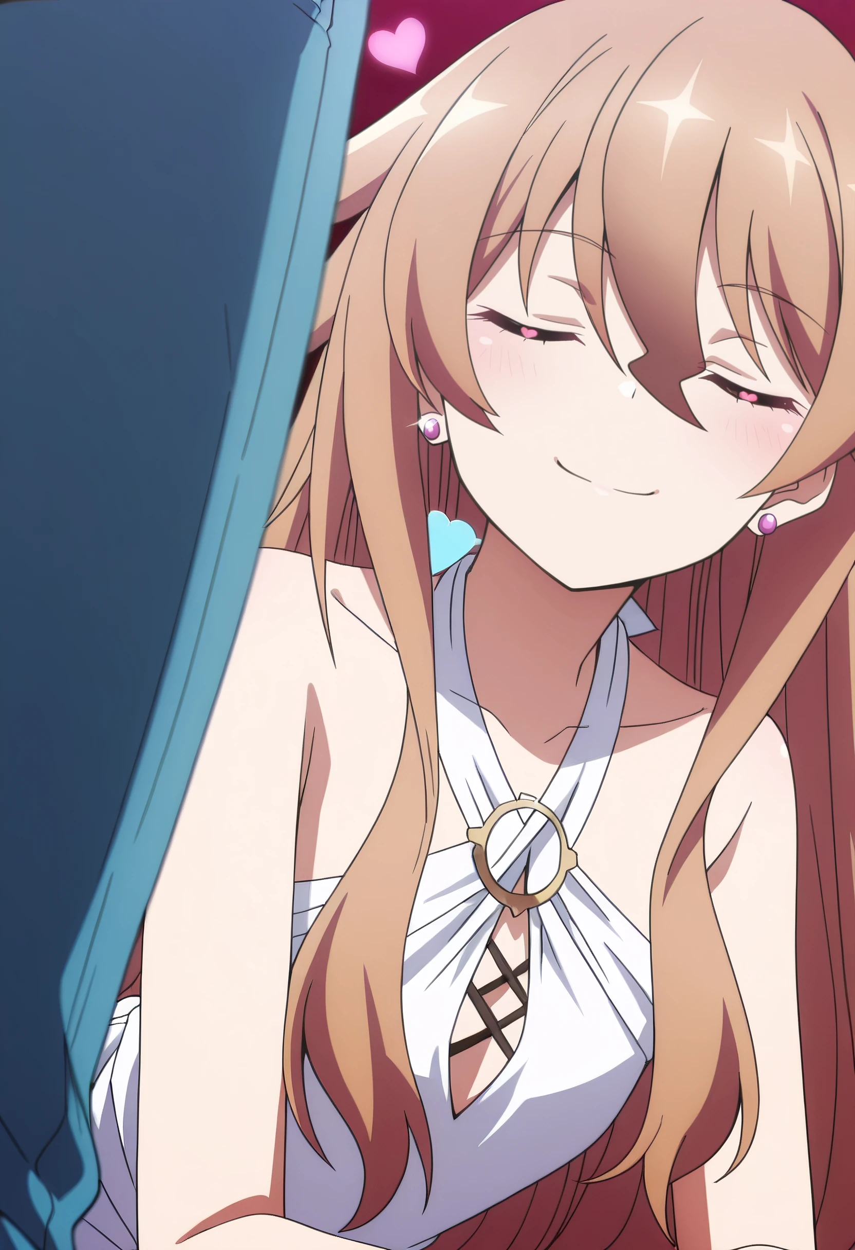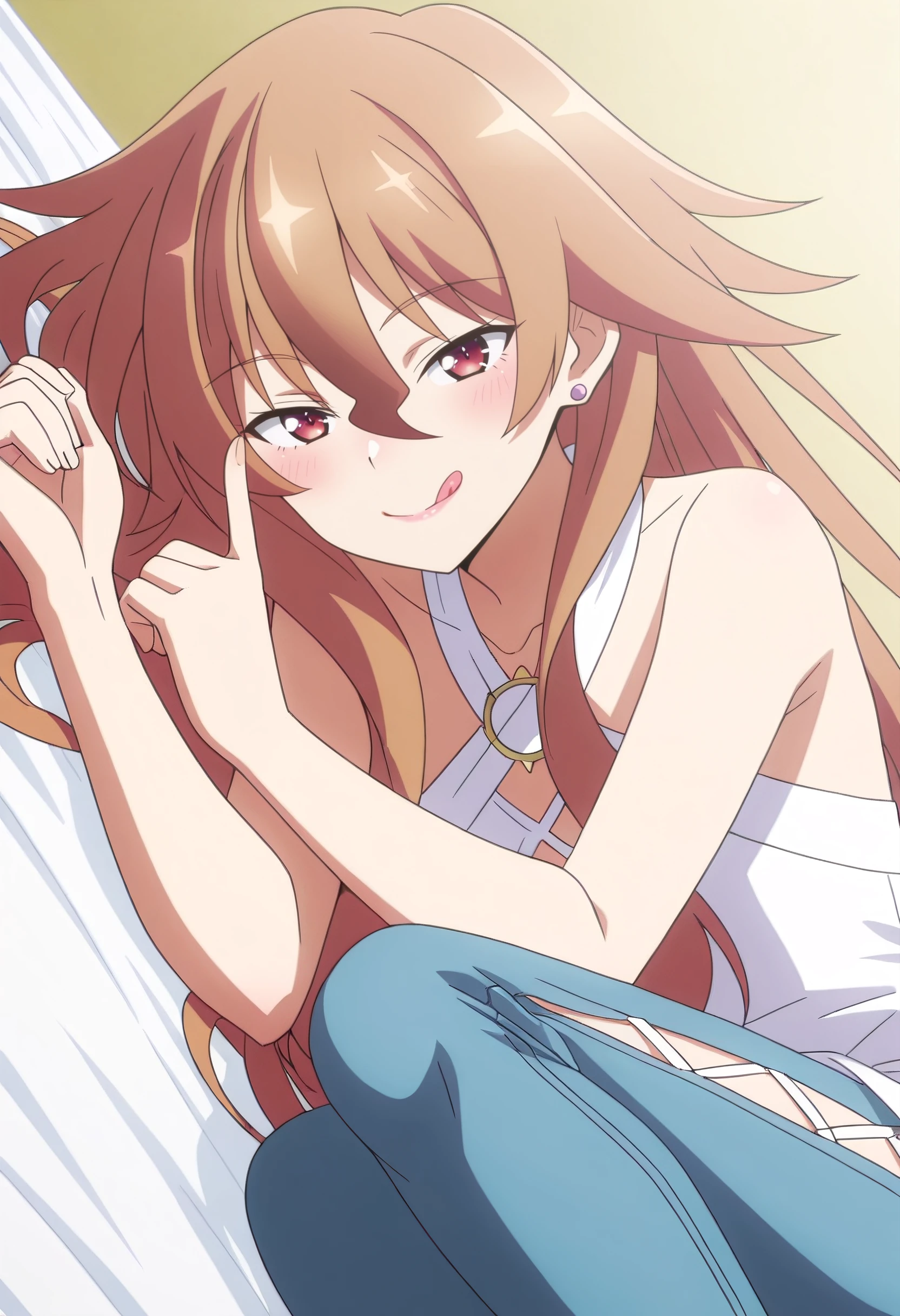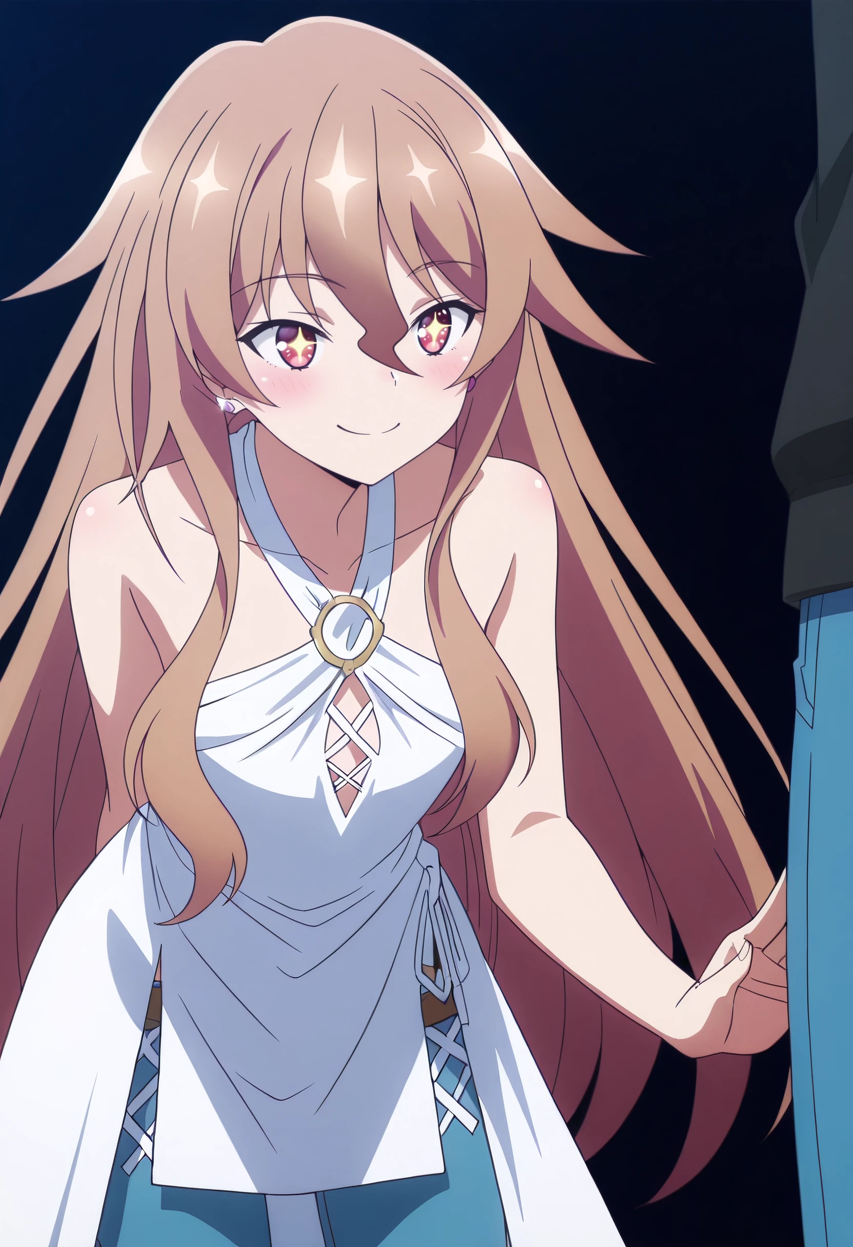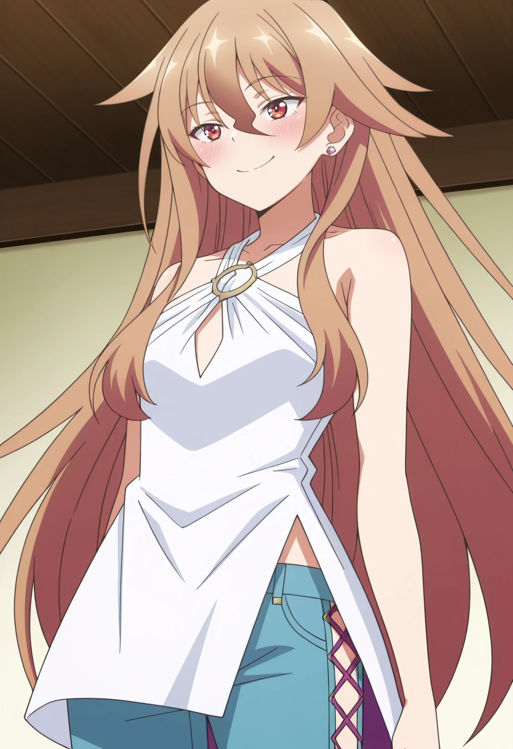 HulemyShirt, bare shoulders, jewelry, collarbone, dress, earrings, halterneck, white dress, sleeveless, pants, blue pants, jeans, criss-cross halter, sleeveless dress, bare arms, o-ring, denim, cross-laced slit, hip vent,