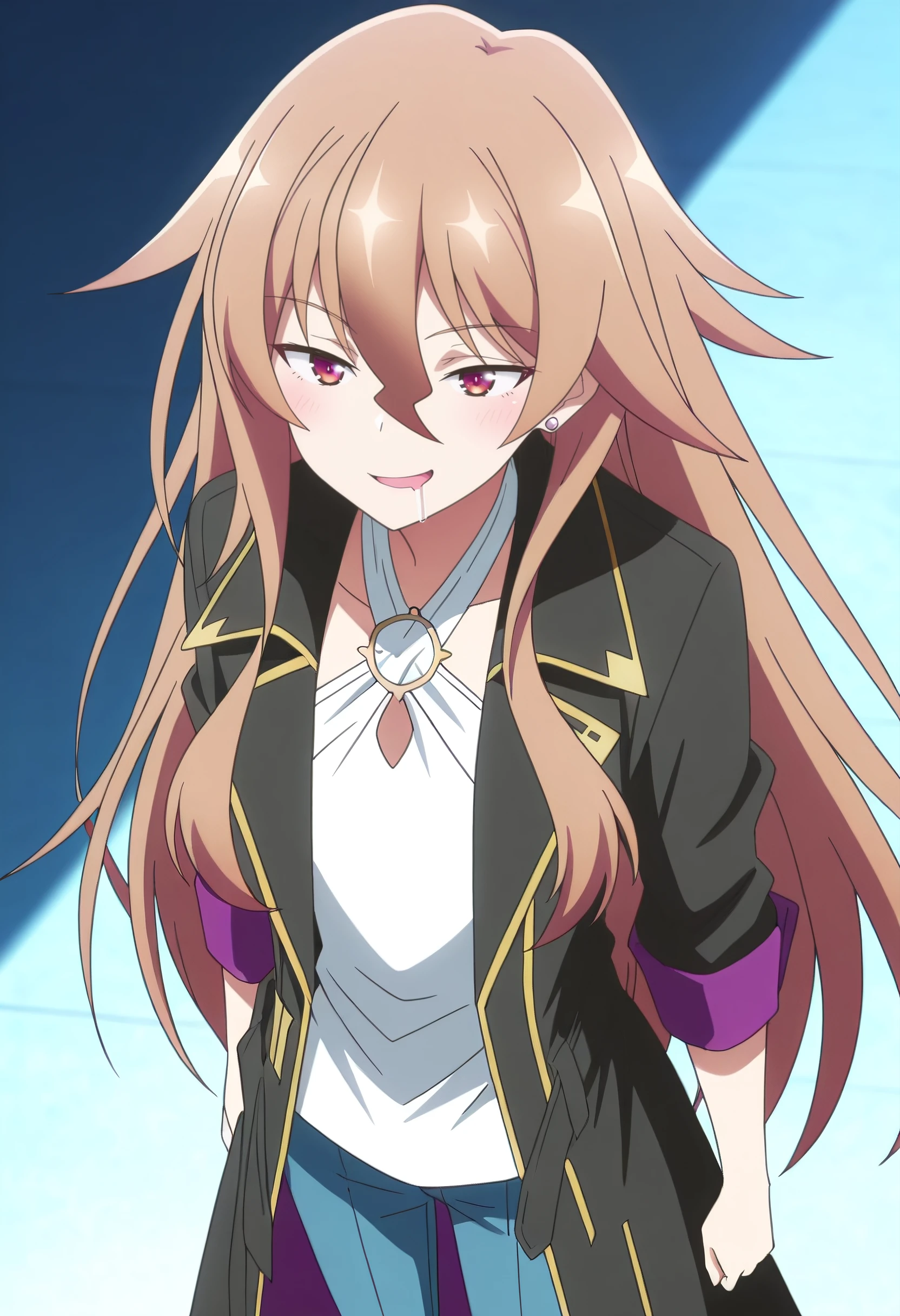 HulemyOutfit, jacket, shirt, black jacket, jewelry, open clothes, earrings, white shirt, coat, black coat, long sleeves, open jacket, pants, blue pants, jeans, denim, sleeves rolled up, criss-cross halter,