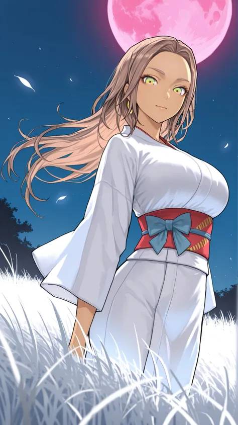 mirka, 1girl, large breasts, multicolored eyes, green eyes, yellow eyes, brown hair, long hair, hoop earrings, black nails, lipstick, black eyeshadow,