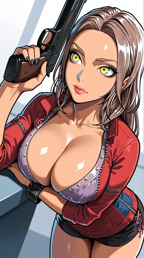 cleavage, mullticolored jacket, red jacket, blue jacket, zipper, unzipped, sleeves rolled up, purple bra, studded bra, black shorts, belt, pink ribbon