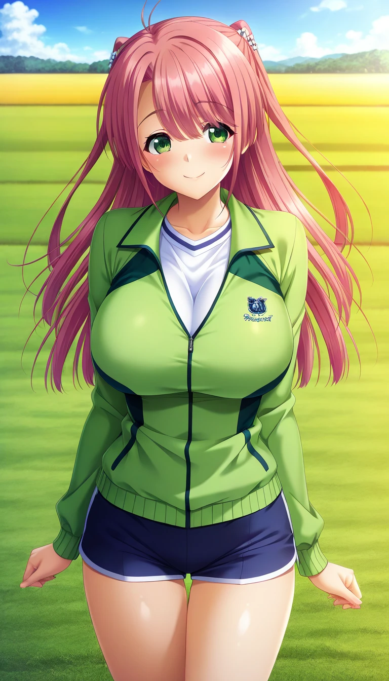 Kurasawa Ayana, pink hair, parted to side, green eyes