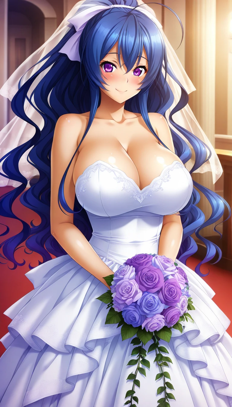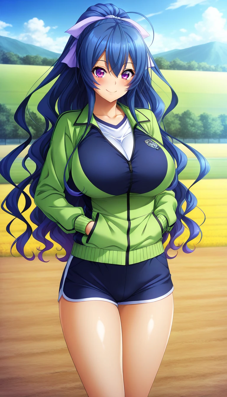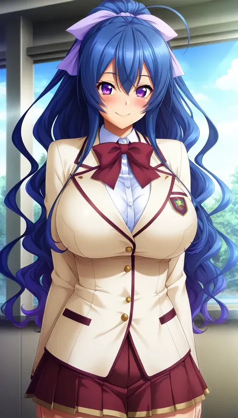 Toujou Mahiro, blue hair, long hair, wavy, ponytail, violet eyes