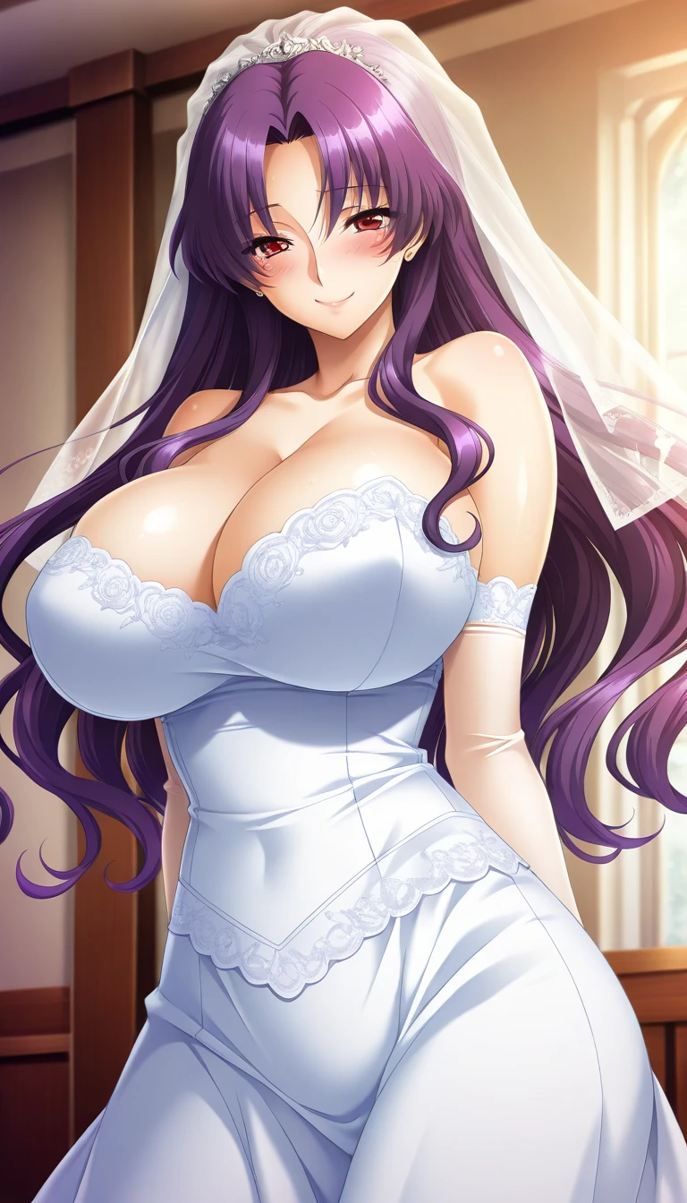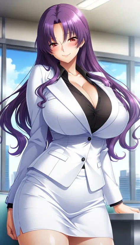 Matsuura Anju, violet hair, long hair, wavy, red eyes
