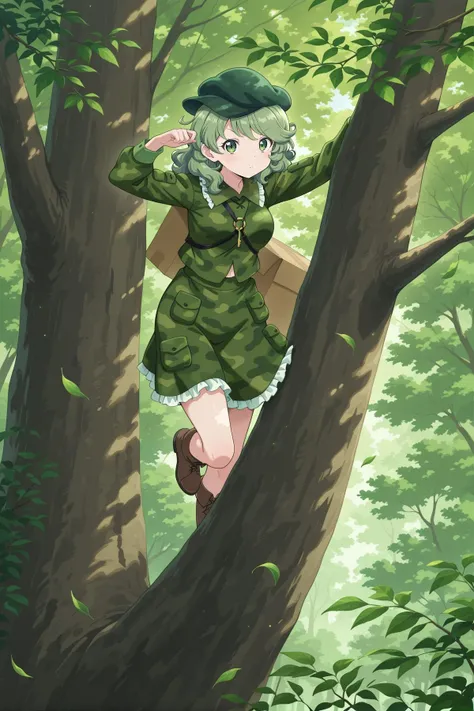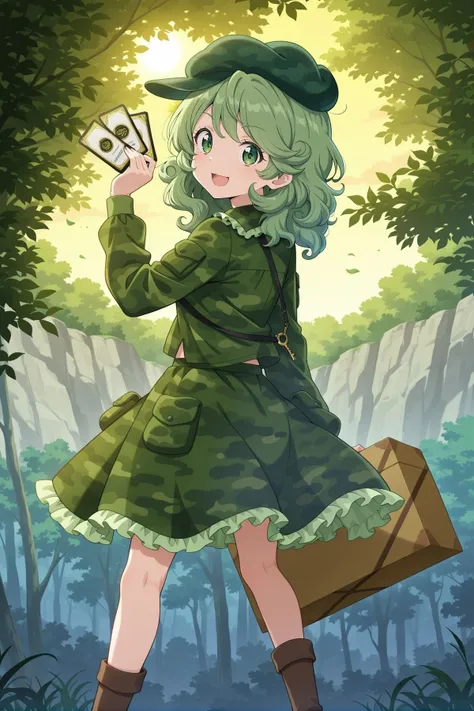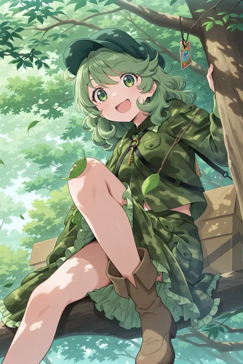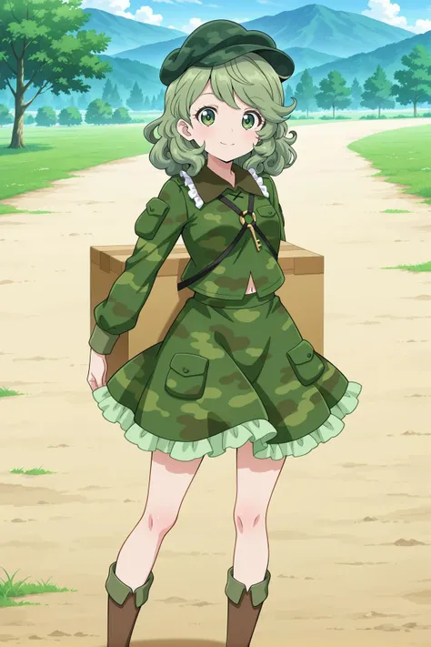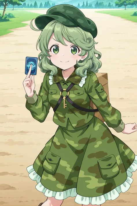 yamashiro takane, 1girl, solo, green eyes, green hair, medium hair,aqua hat, flat cap, key, green shirt, camouflage shirt, long sleeves, pocket, green skirt, camouflage skirt, frilled skirt, brown boots, shoulder strap, Optional :