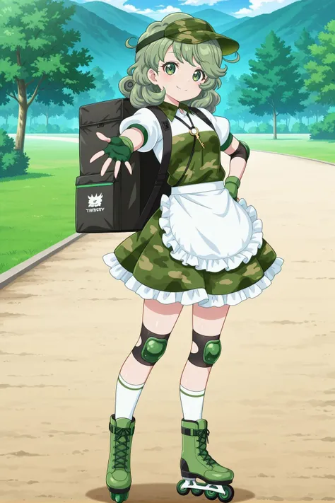 yamashiro takane, 1girl, solo, green eyes, green hair, medium hair, yamashiro takane \(forest fried delivery\), alternate costume, green headwear, flat cap, visor cap, key, white shirt, collared shirt, puffy short sleeves, green top, camouflage dress, white apron, frilled apron, waist apron, elbow pads, green gloves, fingerless gloves, backpack, black bag, insulated delivery bag, knee pads, white socks, green boots, skates,Description