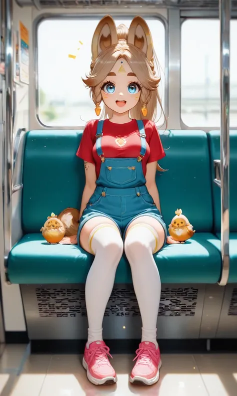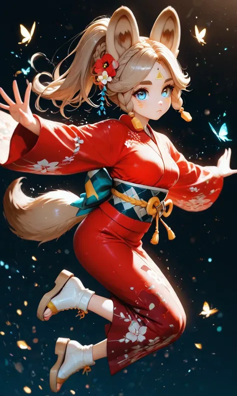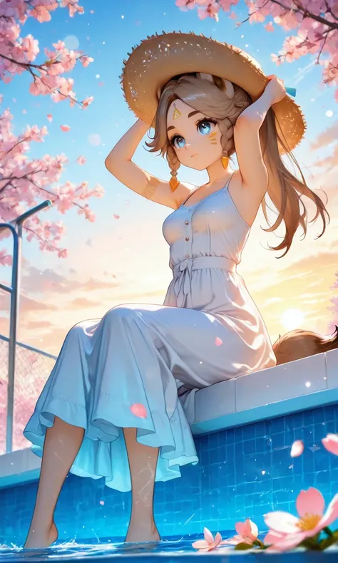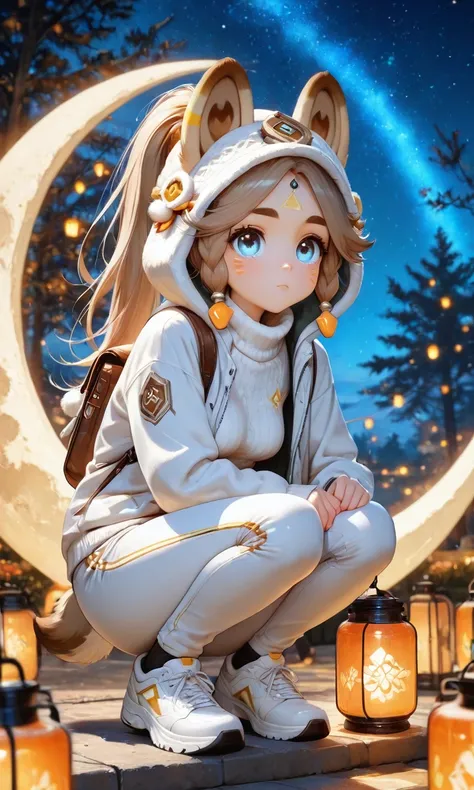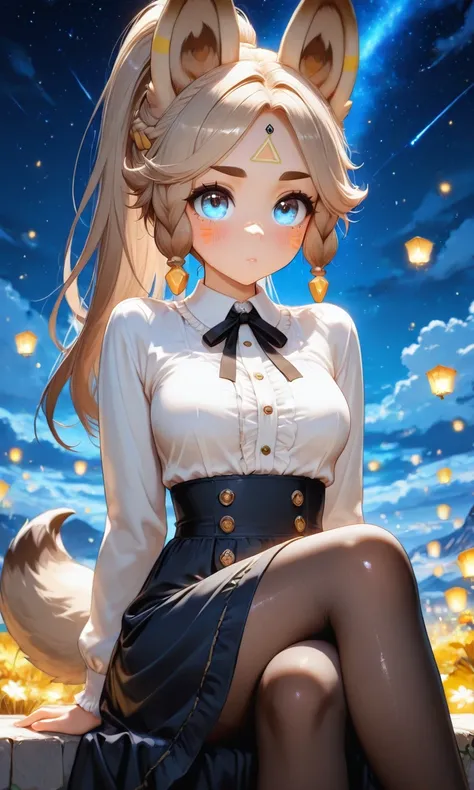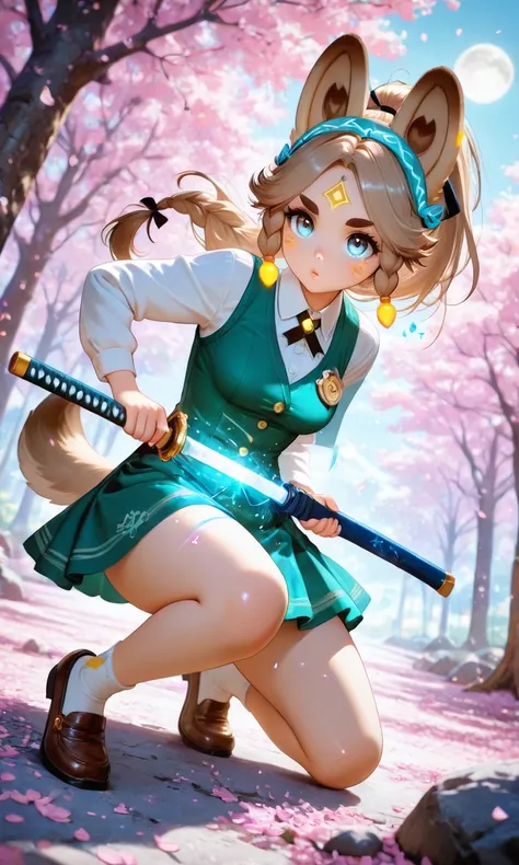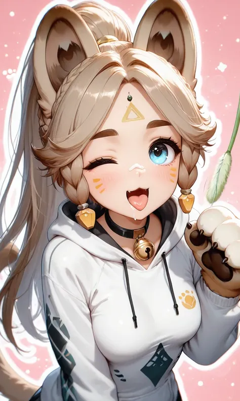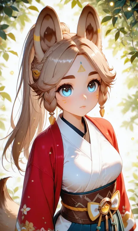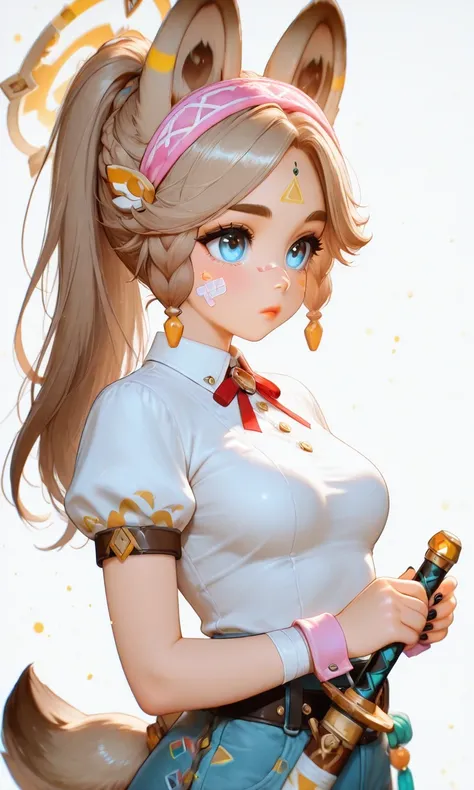 Kachina_Genshin, animal ears, long hair, braid, high ponytail, brown hair, thick eyebrows, facial mark, blue eyes, parted bangs, tattoo, animal_tail