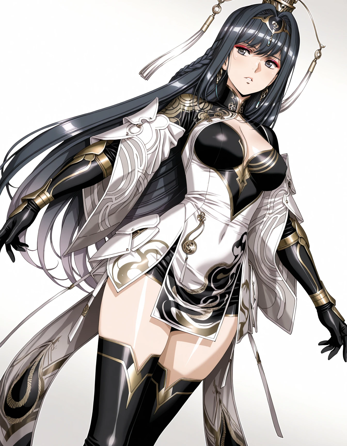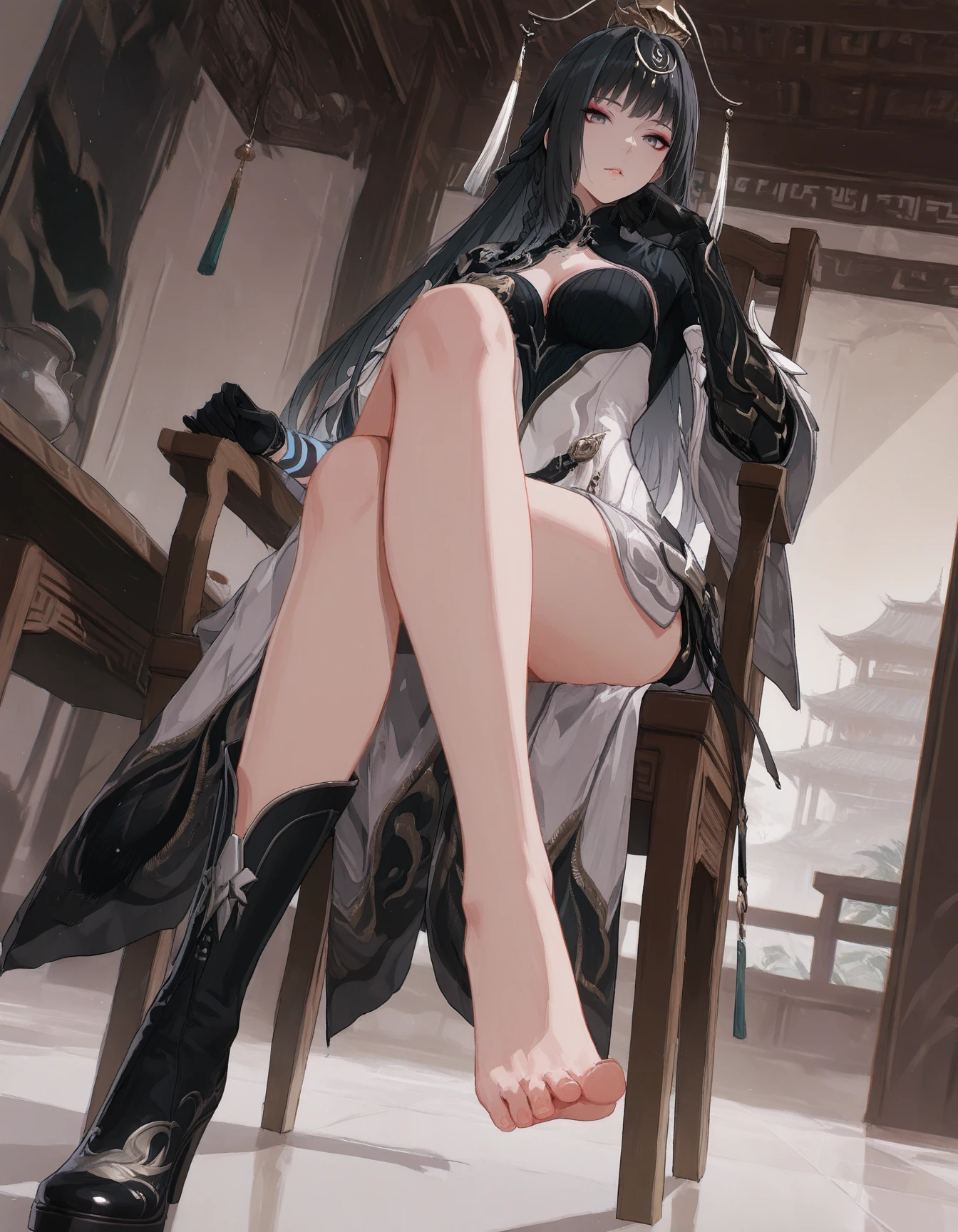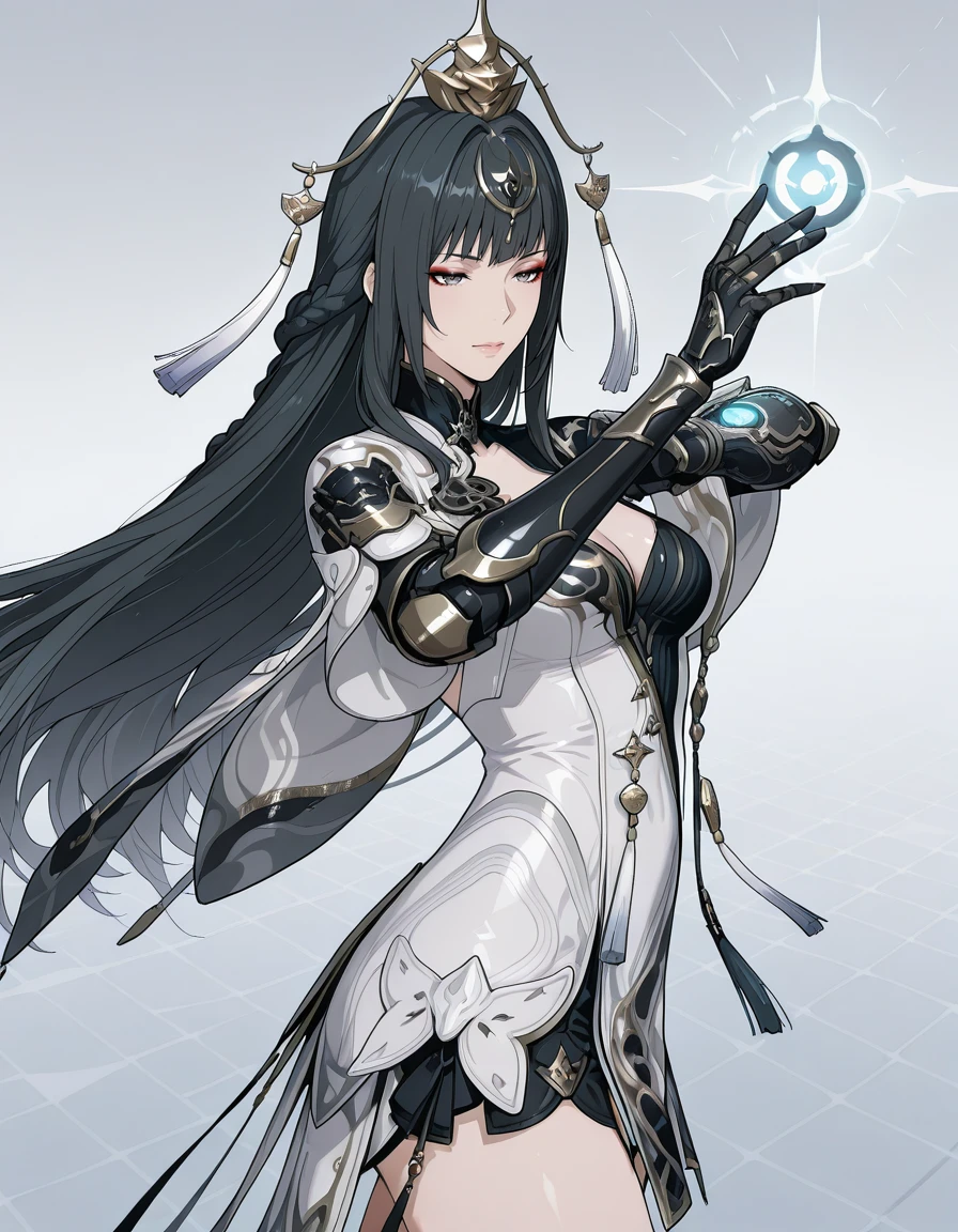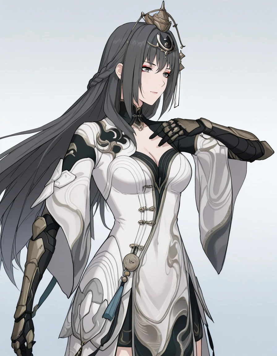 mai_pgr_qu_qm,mature_female,(aged_up:1.5),long_hair,braid,black_hair,grey_eyes,eyeshadow,hair_ornament,tassel,white_dress,chinese_clothes,cleavage_cutout,mechanical_arms,black_gloves,high_heel_boots,black_footwear