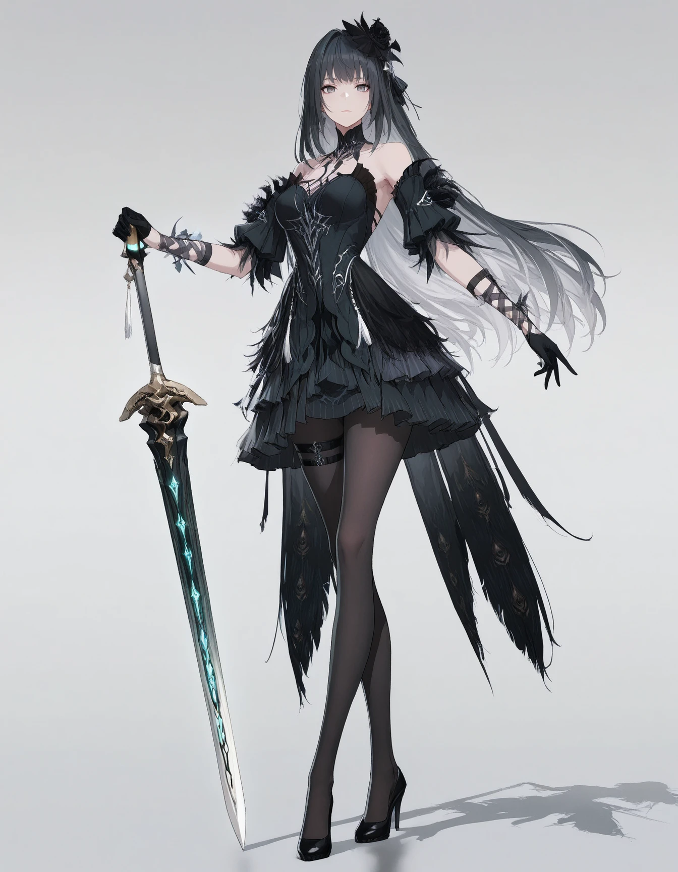 mai_pgr_qu_qm_hlfp,mature_female,(aged_up:1.5),long_hair,black_hair,grey_eyes,hair_ornament,veil,black_dress,bare_shoulders,detached_sleeves,short_sleeves,black_gloves,black_pantyhose,thigh_strap,half_gloves,black_flower,black_feathers,feather_trim,high_heels,black_footwear,holding_swordRecommend preferred Strength: 0.8~1.