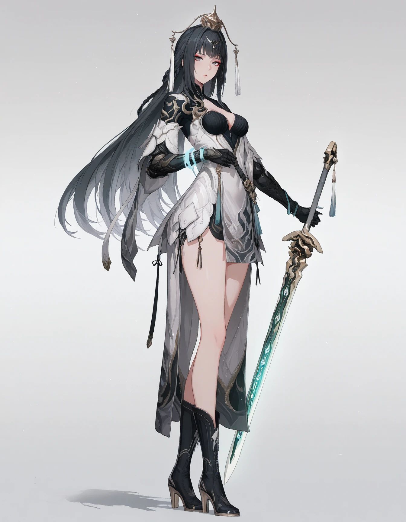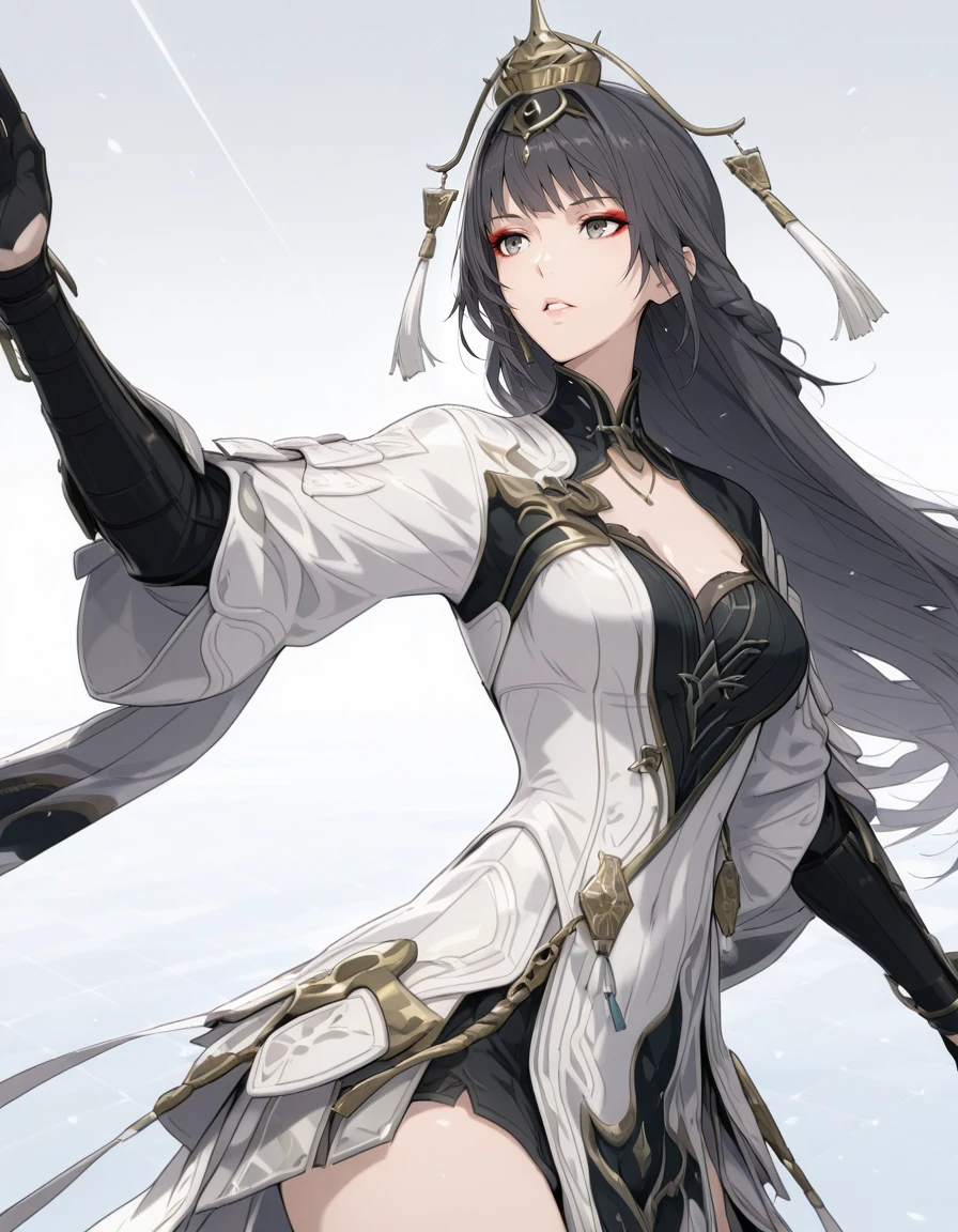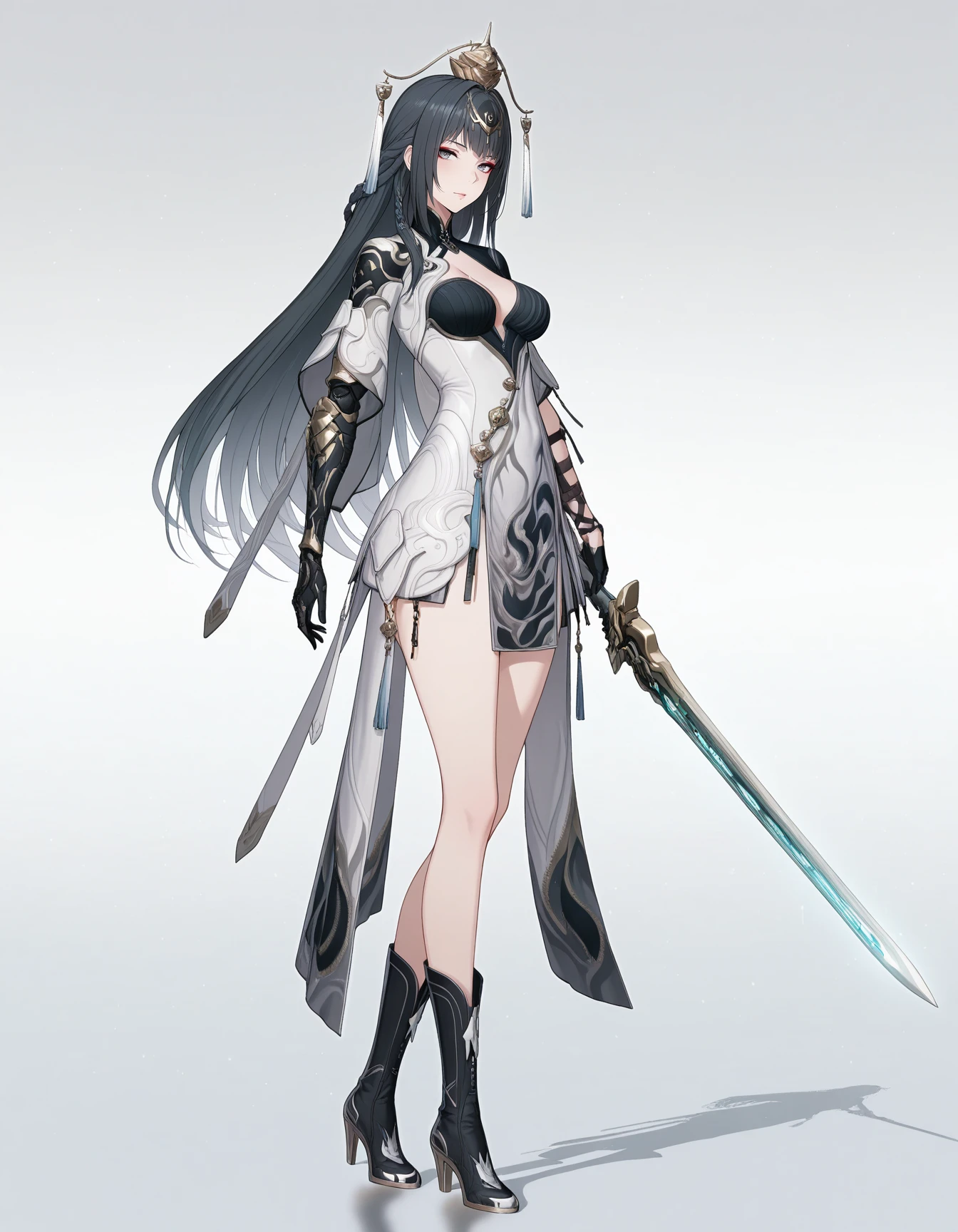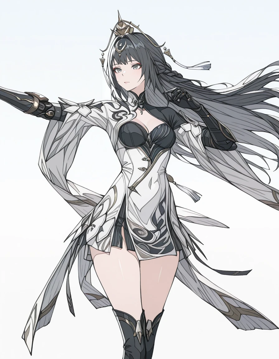mai_pgr_qu_qm,mature_female,(aged_up:1.5),long_hair,braid,black_hair,grey_eyes,eyeshadow,hair_ornament,tassel,white_dress,chinese_clothes,cleavage_cutout,mechanical_arms,black_gloves,high_heel_boots,black_footwear,holding_sword灰翎飞翩 :