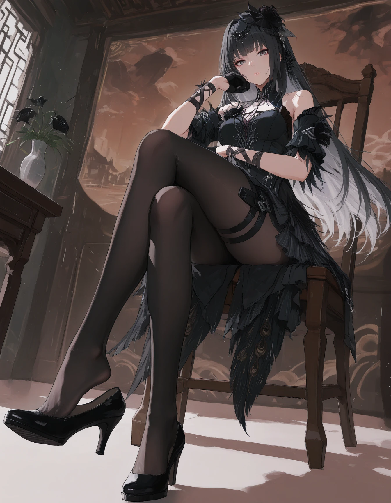 mai_pgr_qu_qm_hlfp,mature_female,(aged_up:1.5),long_hair,black_hair,grey_eyes,hair_ornament,veil,black_dress,bare_shoulders,detached_sleeves,short_sleeves,black_gloves,black_pantyhose,thigh_strap,half_gloves,black_flower,black_feathers,feather_trim,high_heels,black_footwear