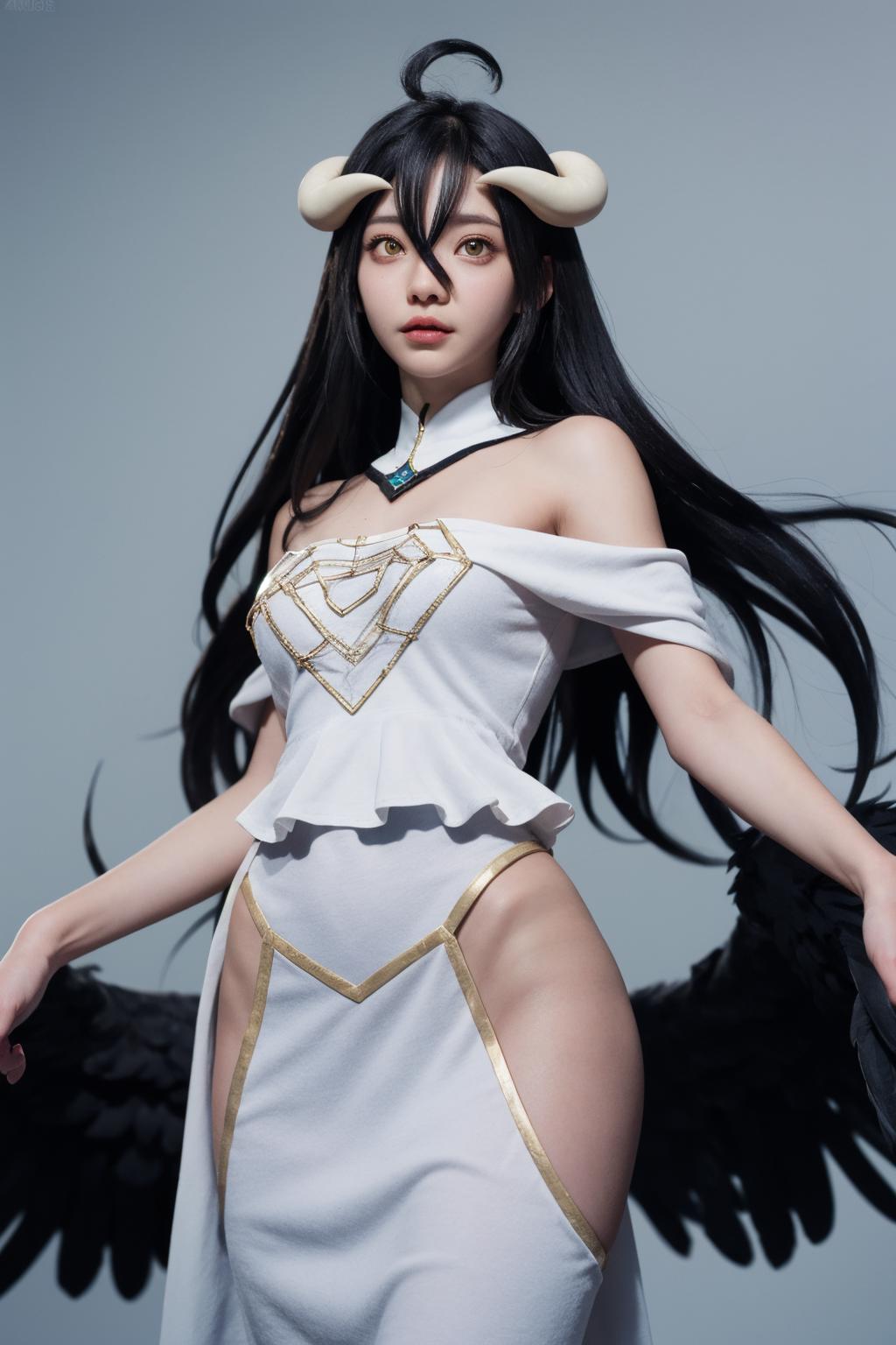 albedo_overlord, hair between eyes, white dress, bare shoulders, dress, low wings, ahoge, black feathers