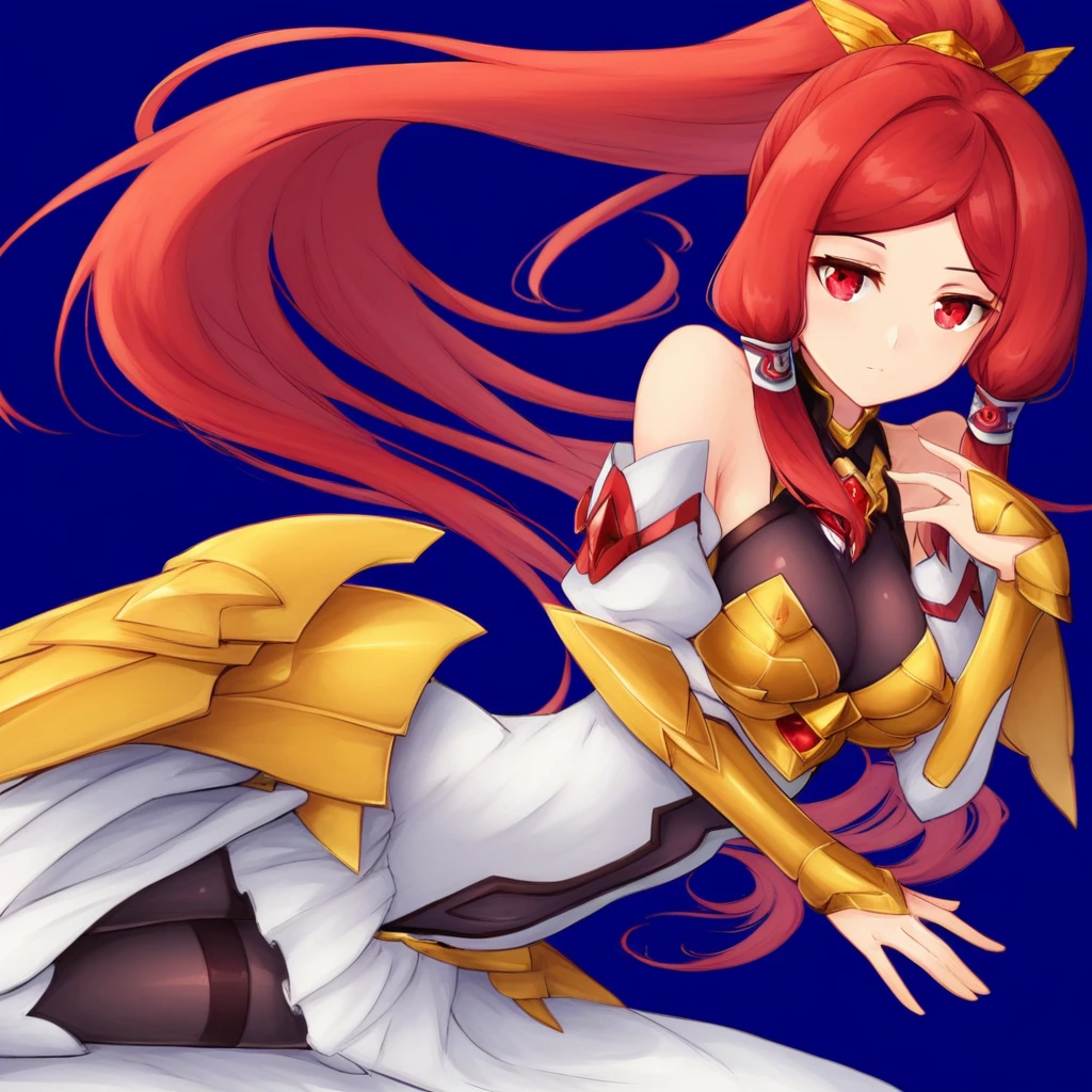 red hair, red eyes, long hair, ponytail, hair ornament, hair tubes,
