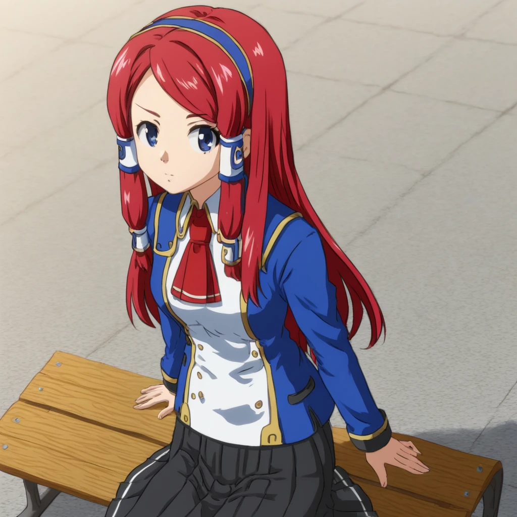 blue hairband, school uniform, white shirt, blue coat, red tie, pleated skirt, black skirt, pantyhose,