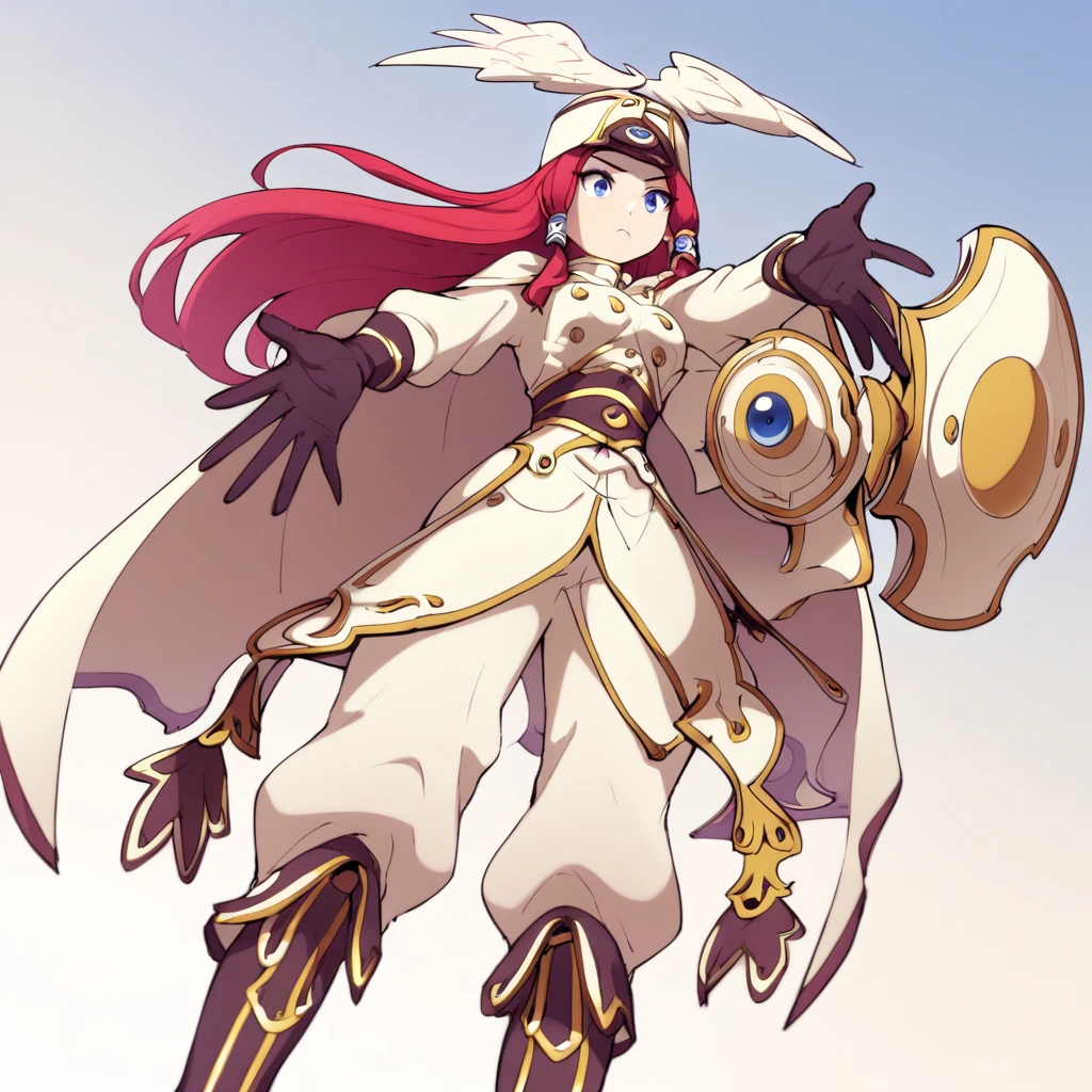 winged hat, black gloves, cape, military uniform, white military uniform, white pants, shield, knee boots, black footwear,
