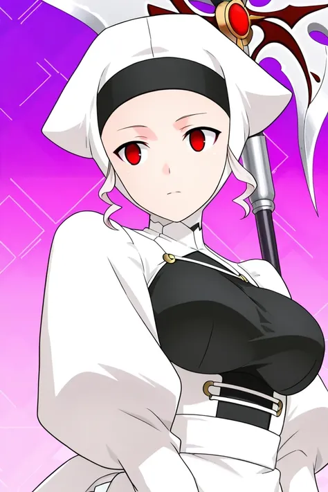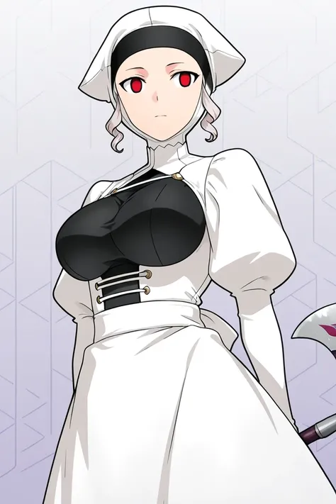 curled sidelocks, white dress, white headwear, turtleneck, black hairband, geometric collar pattern, bodysuit, traditional maid outfit, white coif headpiece with side flaps, dark band across forehead, juliet sleeves, underbust, long white sleeves, black bodice panel, breasts, white corset