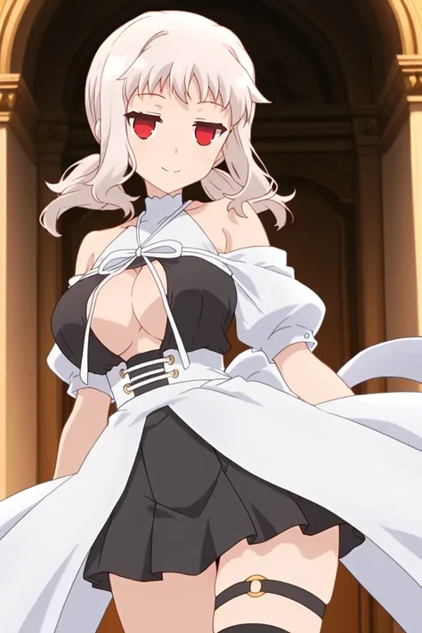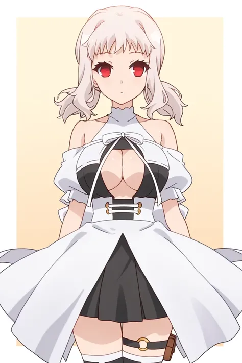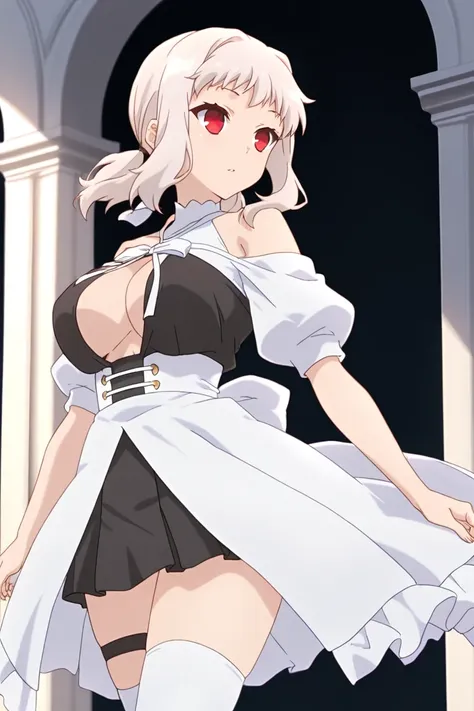 low twintails, sidelocks, skirt, large breasts, dress, bow, cleavage, pleated skirt, white and black dress, puffy short sleeves, clothing cutout, no bra, white off-shoulder sleeves, white bow, center opening, white turtleneck, white puffy sleeves, open clothes, cleavage cutout, deep cleavage window, black halter-style straps, ribbon tied at neckline, white corset belt with gold eyelets, frills, black skirt, miniskirt, thighhighs, black short dress, white overskirt
