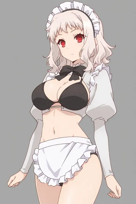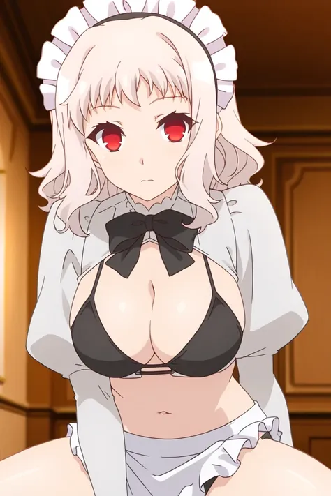 maid headdress, bow, ribbon, cleavage, underwear, bikini, open clothes, bowtie, bra, black bow, black bowtie, maid outfit, sexy maid, black and white color scheme, long white sleeves, juliet sleeves, black bra, unconventional maid, waist apron, maid bikini, navel, swimsuit style, clothing cutout, midriff, thighs