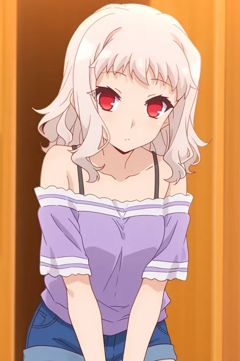 lizfate, red eyes, white hair, wavy hair, medium hair, shirt, bare shoulders, off-shoulder shirt, collarbone, short sleeves, off-shoulder top, white shirt, halter bikini strap, dark blue strap, red trim, casual clothes, off shoulder, short shorts, denim, blue shorts, denim shorts