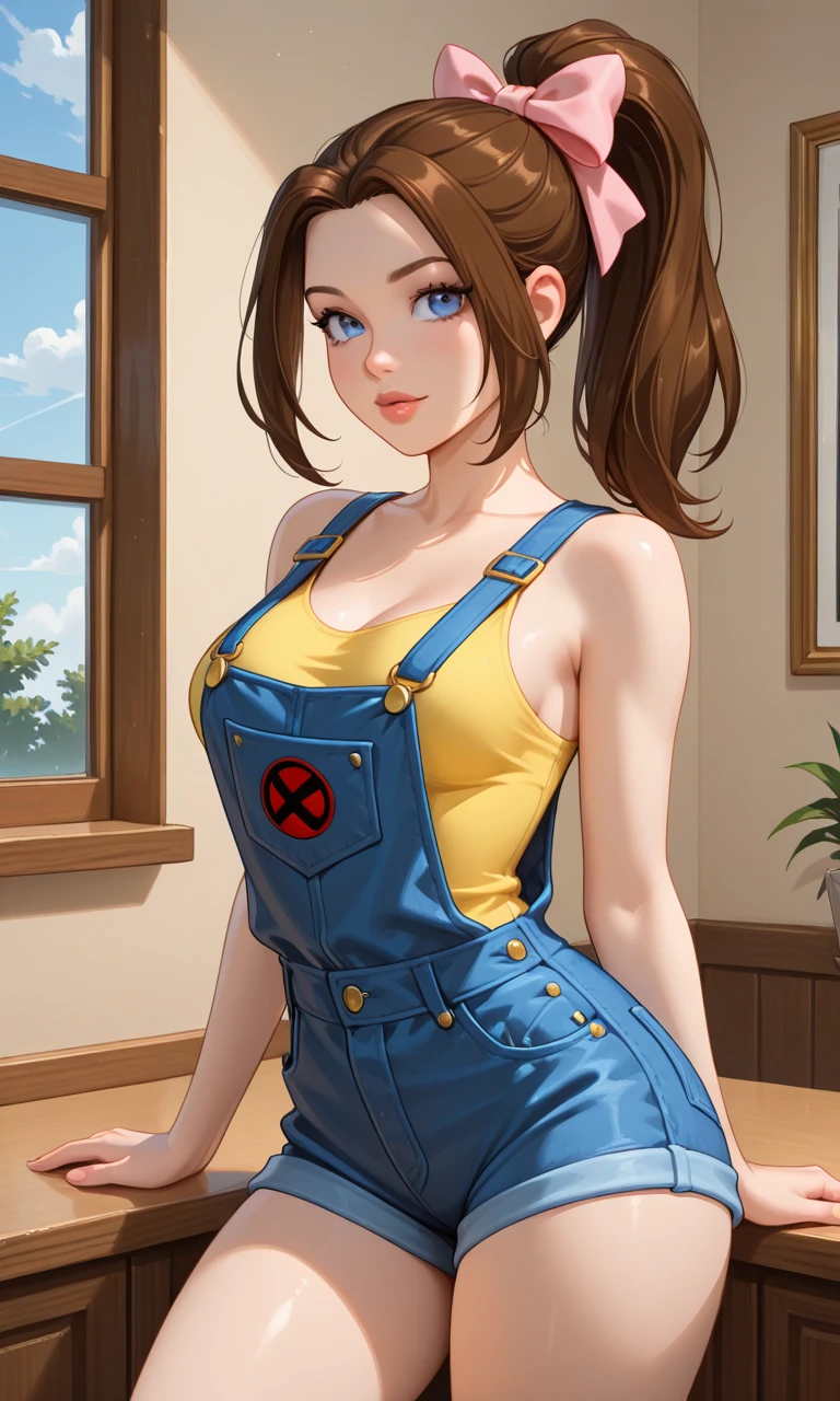 Kitty Pryde/Shadowcat (X-Men Evolution), 1girl, solo, breasts, brown_hair, ponytail, lips, breasts, blue_eyes, sidelocks, hair_ribbon, pink_ribbon, Thighs, parted bangs, médium breasts,