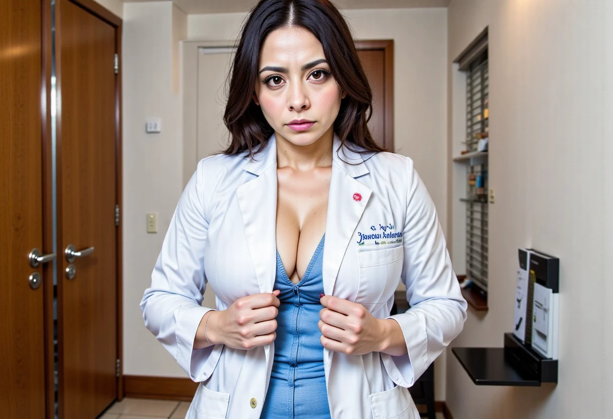 Hispanic, d cup, 37 year old Hispanic woman, d cup breasts, doctor lab coat over stylish dress, black heels, full body visible, looking at viewer with a judgemental, disappointed expression, dominatrix, dark brown eyes