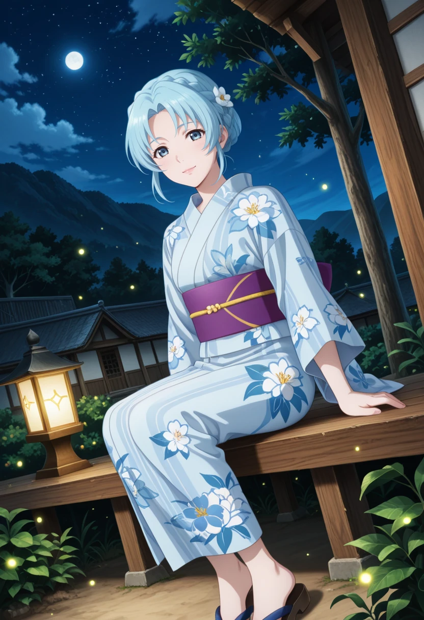 tolgrune, blue hair, short hair, tied hair, hair ornament, braid, parted bangs, gruneykt, blue yukata, purple sash, floral print, zōri, sandals,Flowers vieweing costume 花見の服