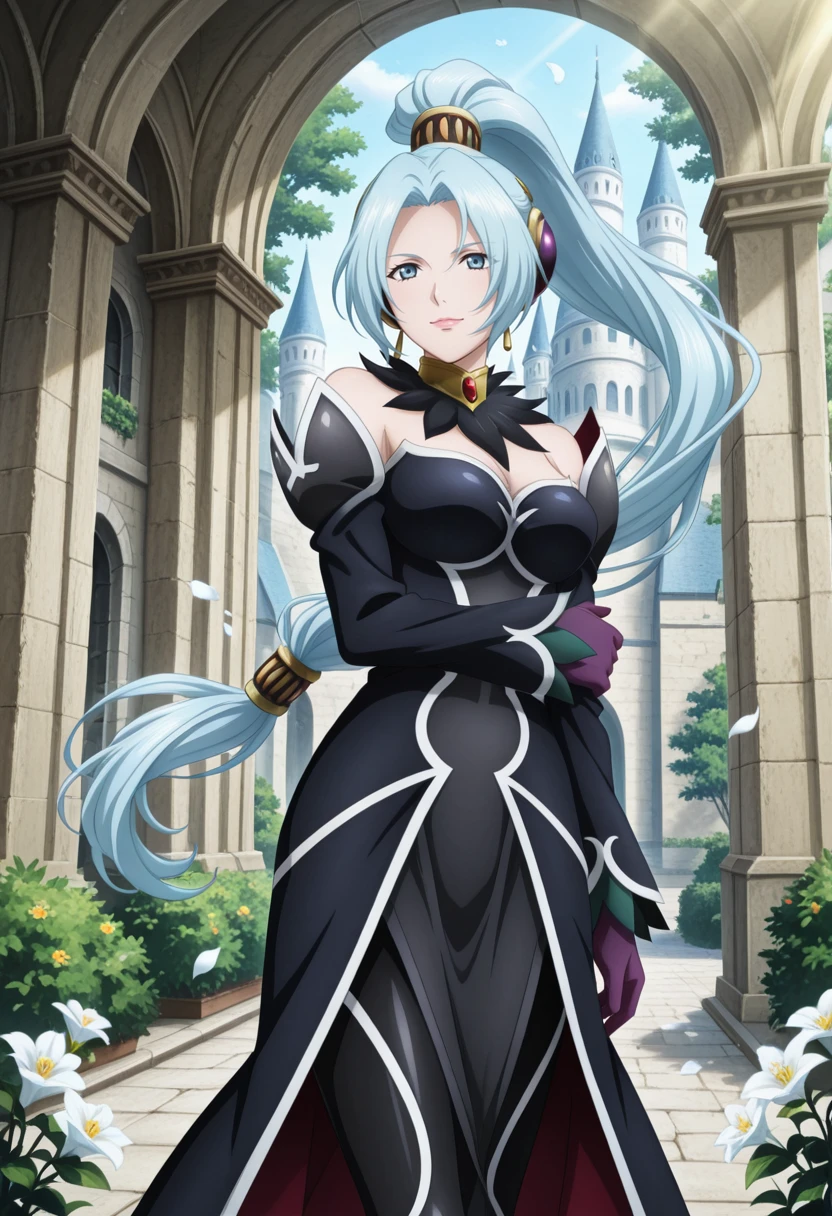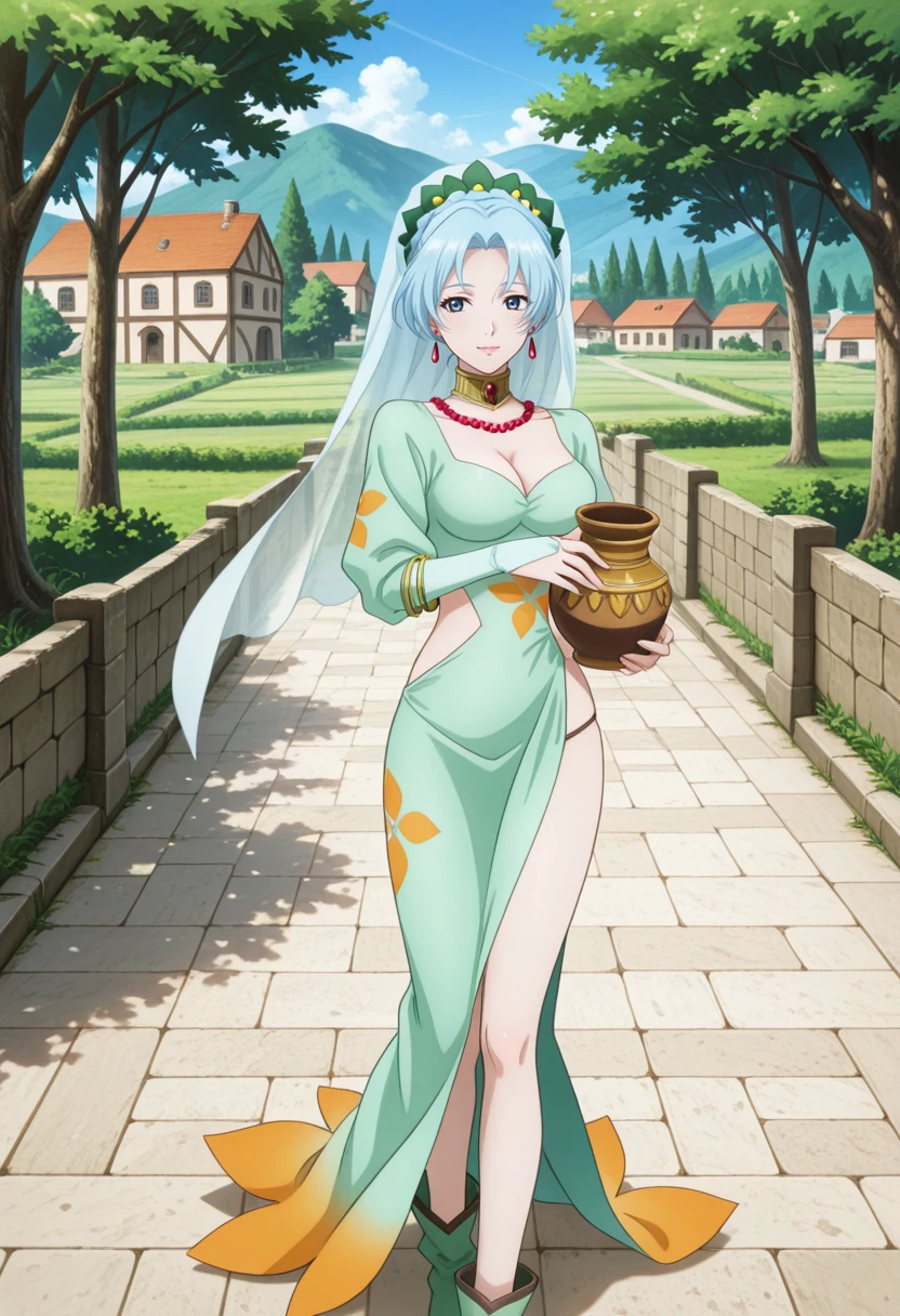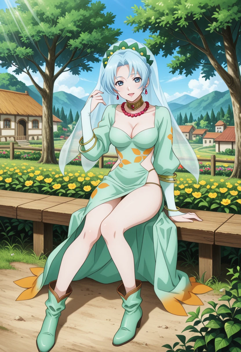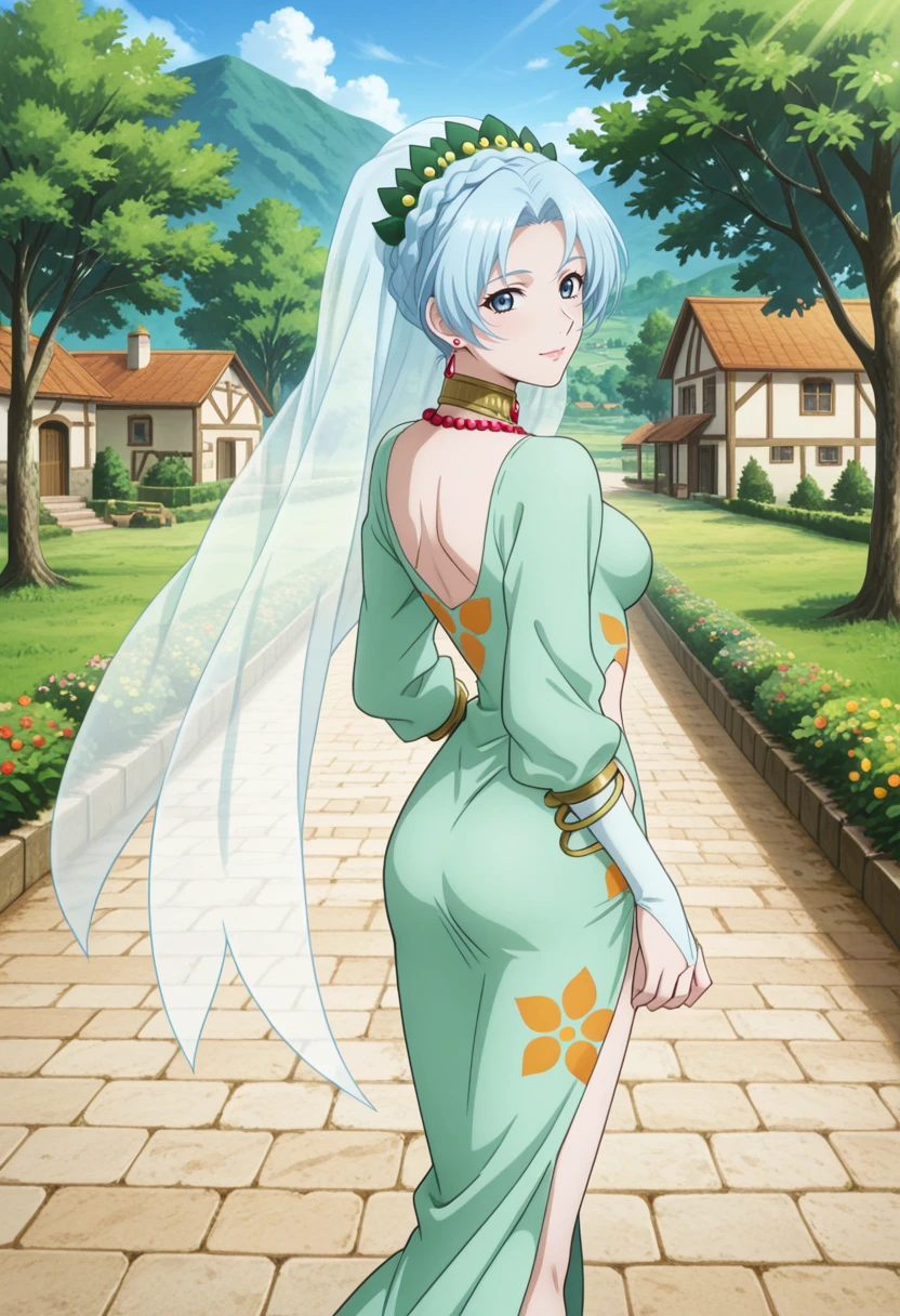 tolgrune, blue hair, long hair, blue eyes, braid, high ponytail, red earrings, parted bangs,grunedef, bridal gauntlets, clothing cutout, green dress, veil, choker, necklace, jewelry, transparent veil, green footwear, Schwarz シュヴァルツ