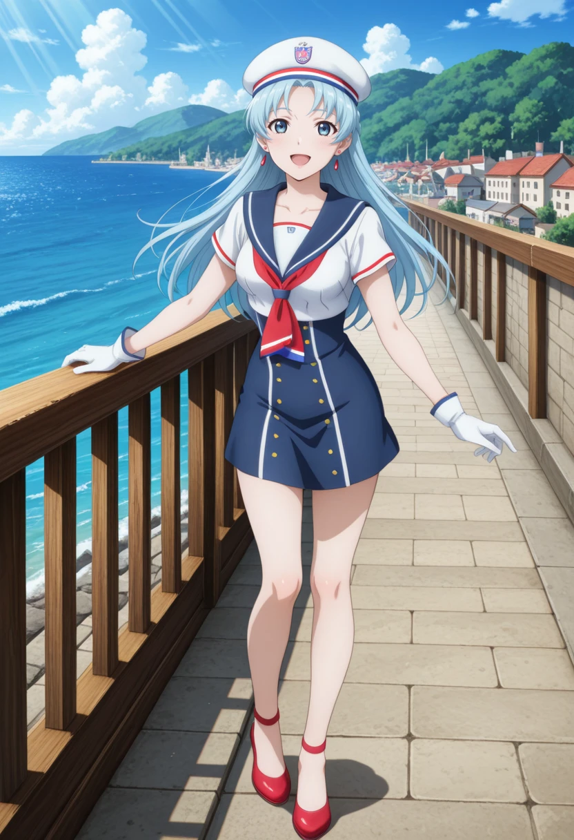 tolgrune, blue hair, blue eyes, long hair, parted bangs, tolsal, sailor hat, sailor collar, sailor uniform, blue skirt, white gloves, short sleeves, green neckerchief, red footwear,