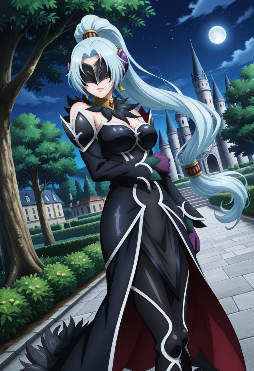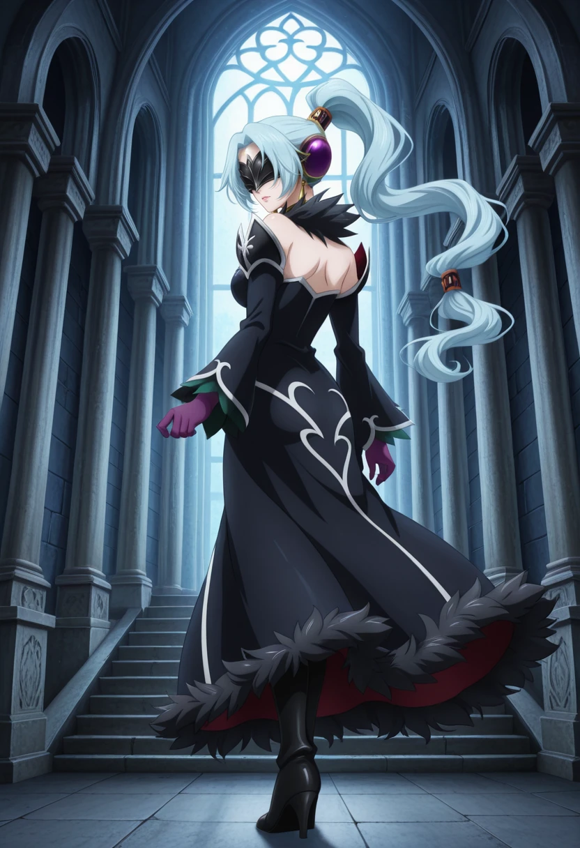 tolgrune, blue hair, long hair, ear covers, parted bangs, high ponytail, wavy hair, tolschwarz, detached sleeves, black dress, mask, earrings, fur trim, purple gloves, thigh boots,