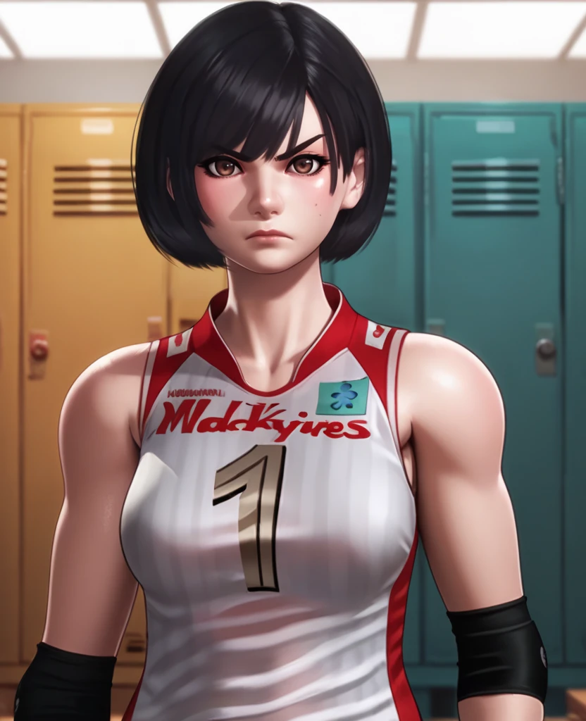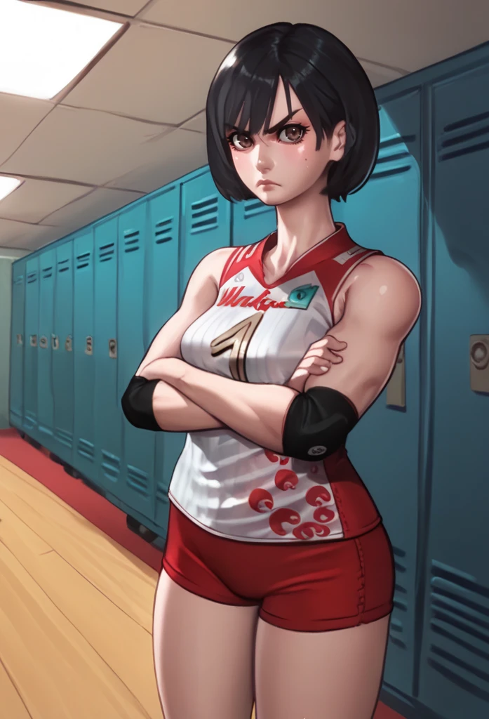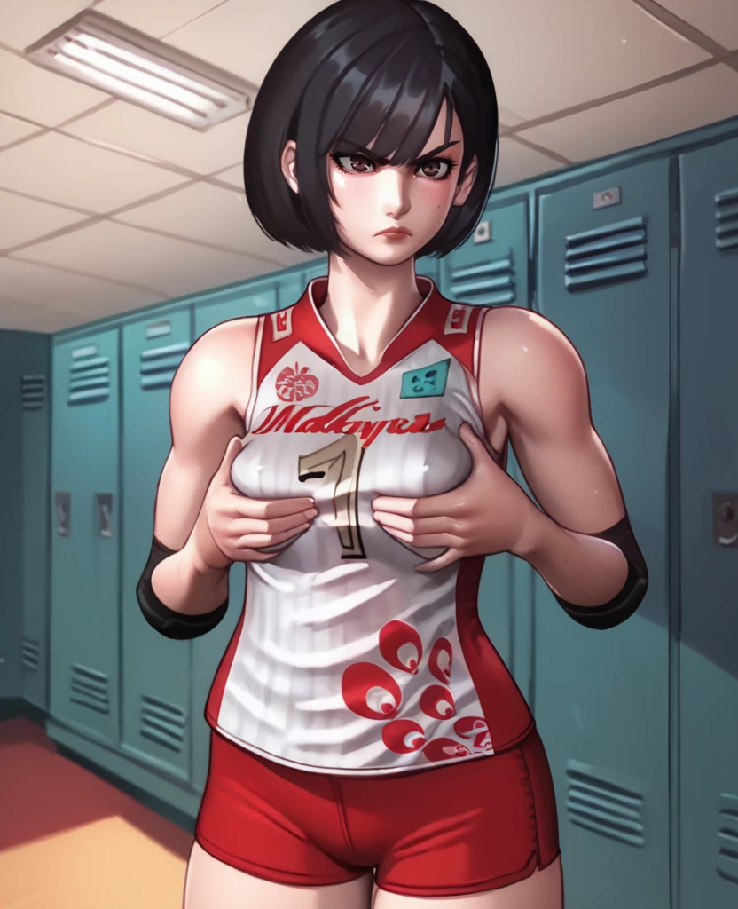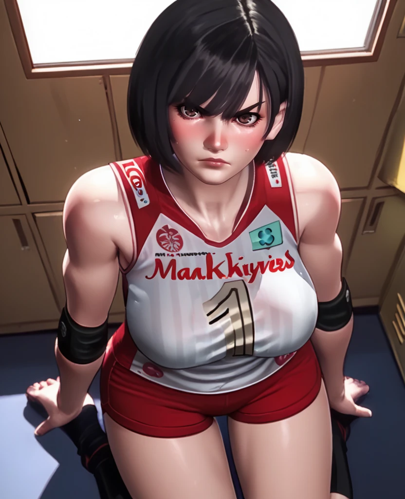 volleyball uniform, red shorts, sleeveless,