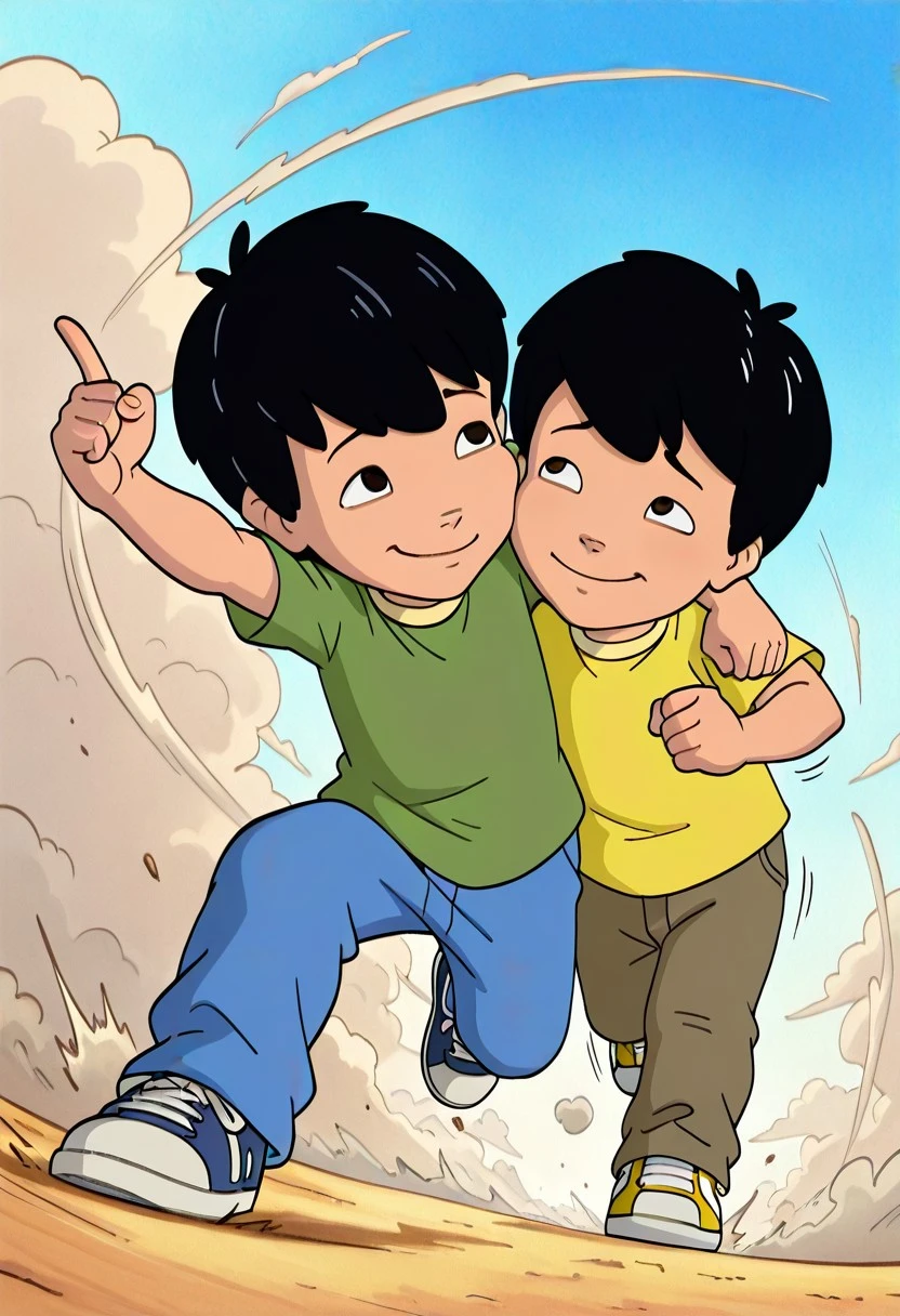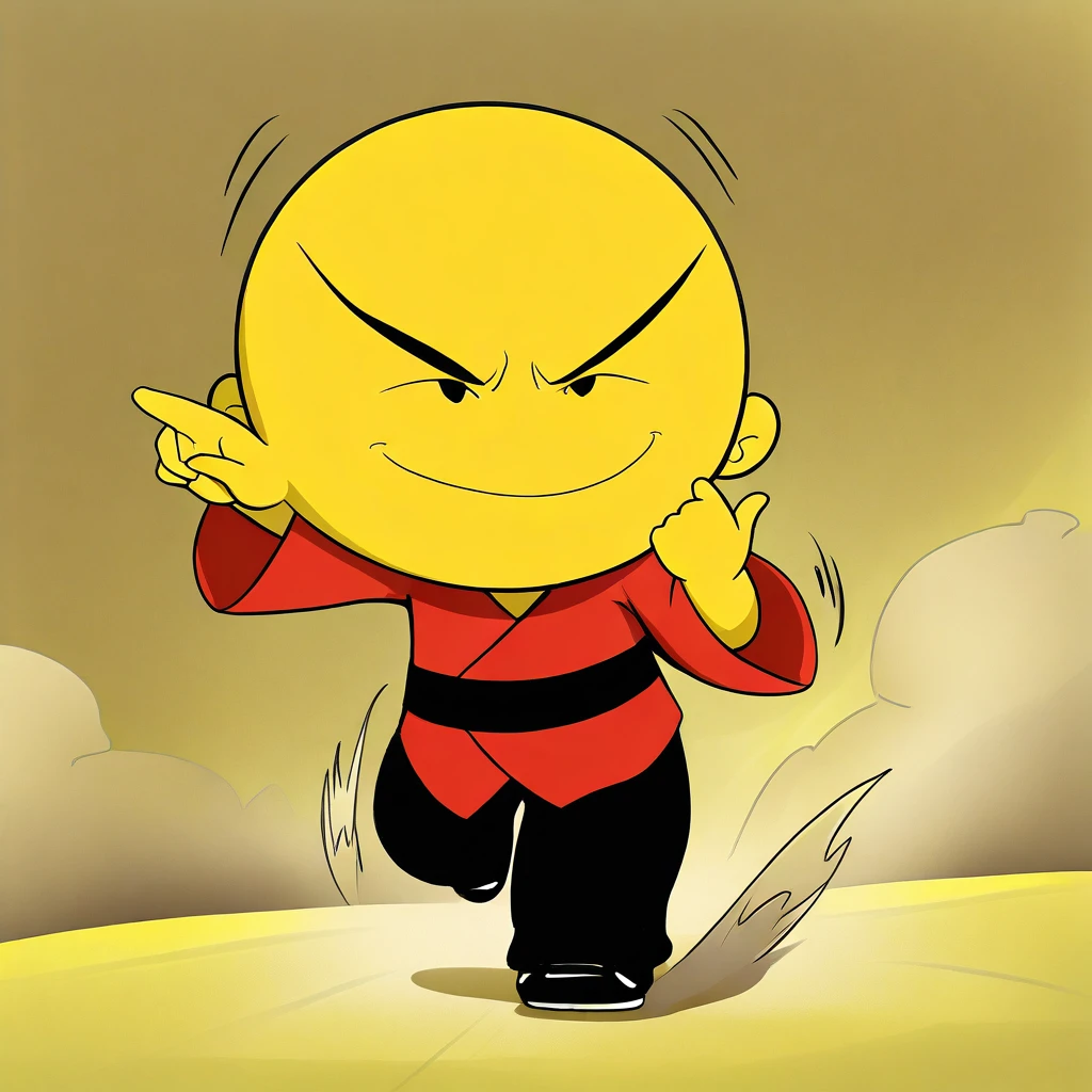 XiaolinOmi, 1boy, solo, male focus, Big round head, black eyes, no sclera, thin eyebrown, round ear, yellow skin,