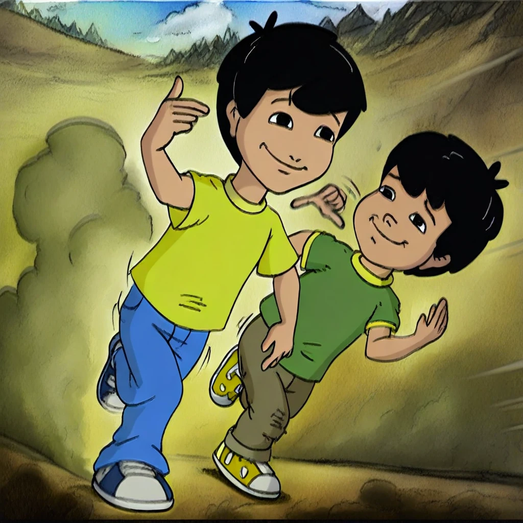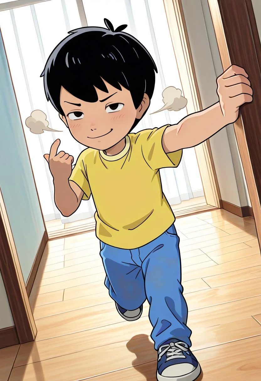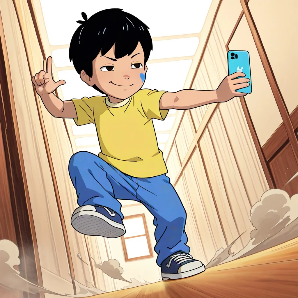 EnriqueDragonTale, black hair, Enrique hair, Enrique face shape, yellow t-shirt, blue jeans, dark blue and white shoes,