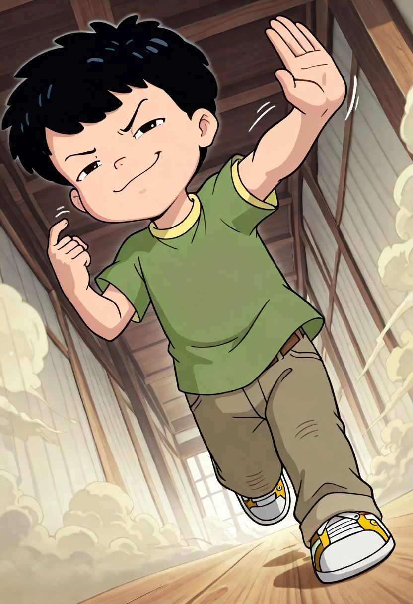 MaxDragonTale, Max hair, black hair, Max face shape, green t-shirt, greyish-brown pants, brown belt, white and dark golden sneakers,