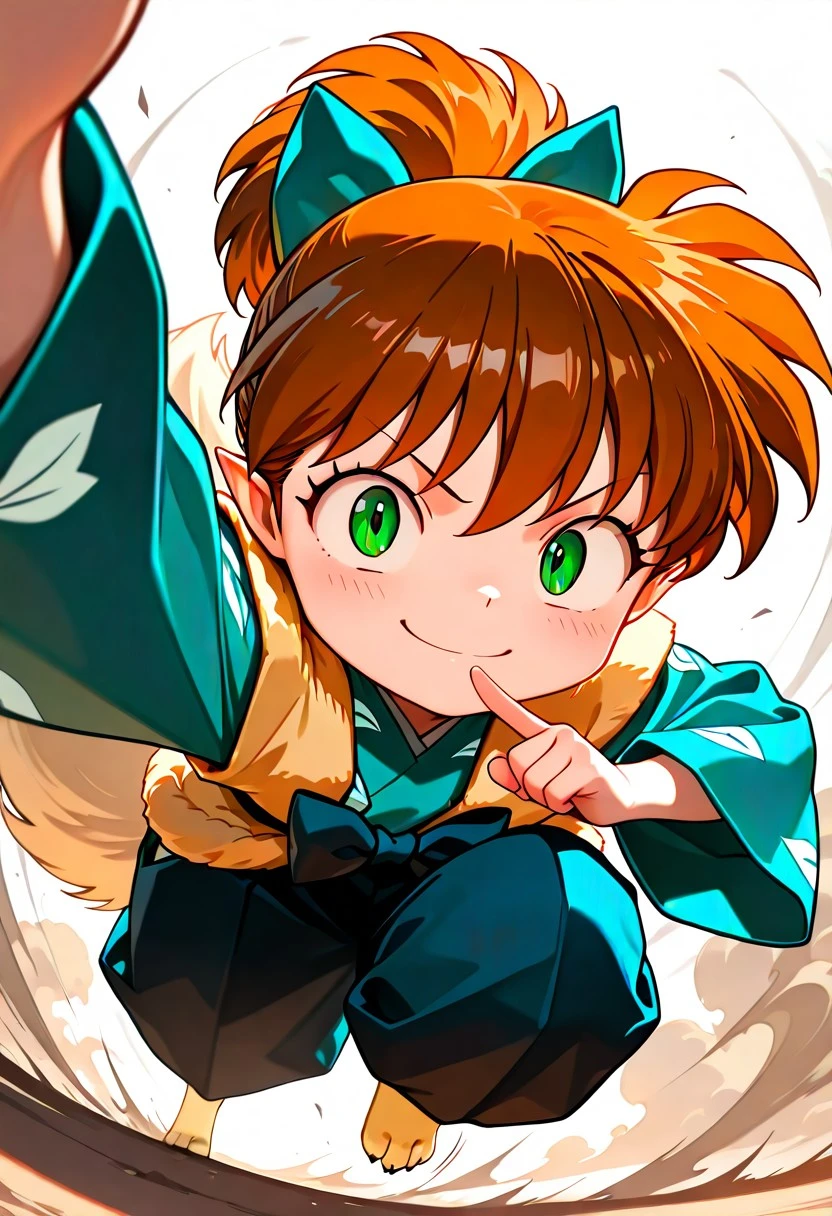 shippou, shippouinuyasha, 1boy, pointy ears, green eyes, brown hair, ponytail, tail, fluffy tail, fox feet, animal feet,