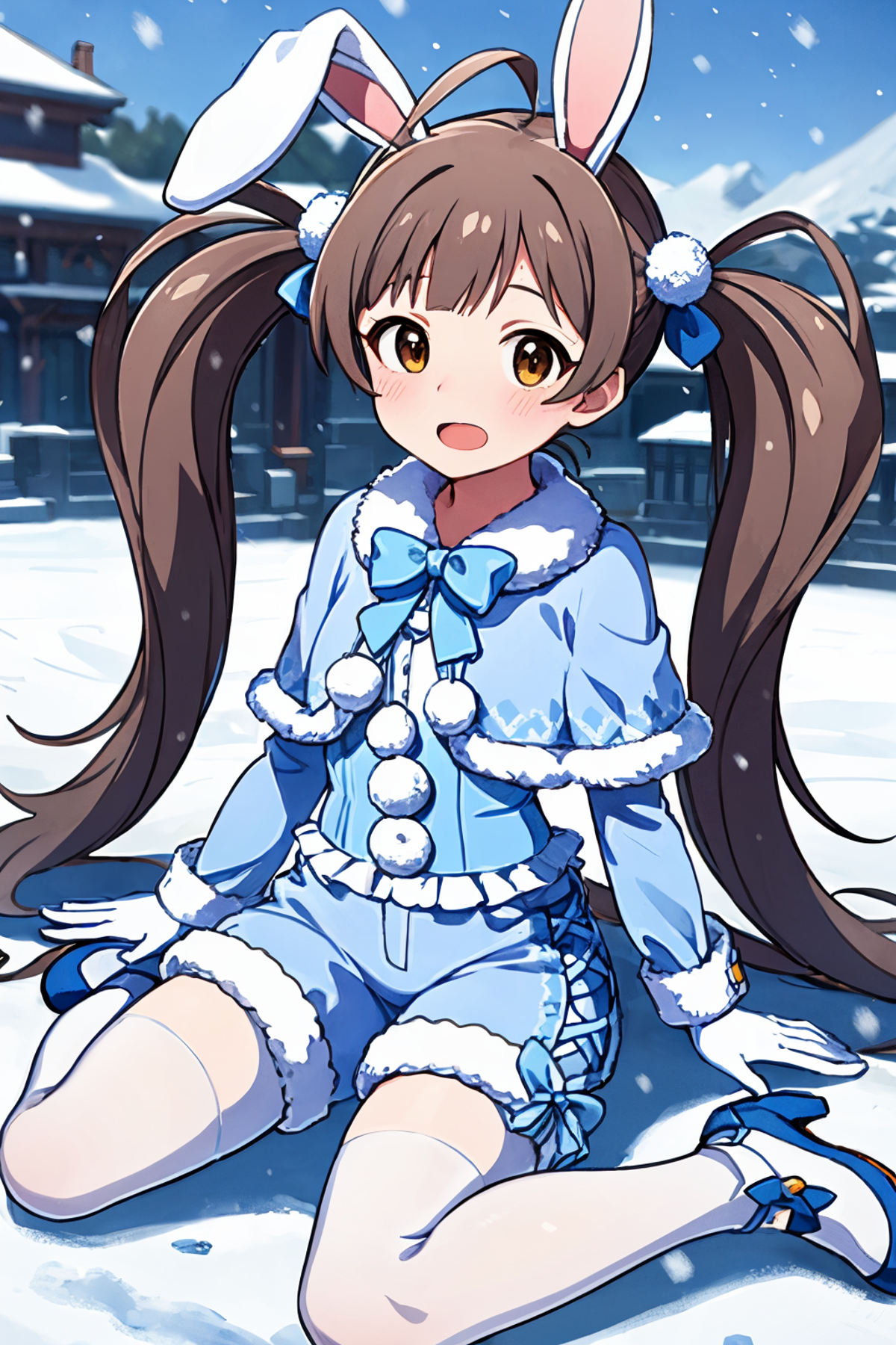 hakozaki serika, twintails, ahoge, ear-and-tail, frilled dress, long sleeves, fur-trimmed capelet, white pantyhose, short shorts, light blue shorts, puffy shorts, legwear under shorts, light blue shirt, fur-trimmed legwear, white legwear, rabbit tail, blue bowtie, shoes, white gloves, fake animal ears, rabbit ears, pom pom \(clothes\)BRAND NEW PERFORMANCE (Outfit name: Nouvelle Tricolore) / BRAND NEW PERFORMANCE (衣装名: ヌーベル・トリコロール)
