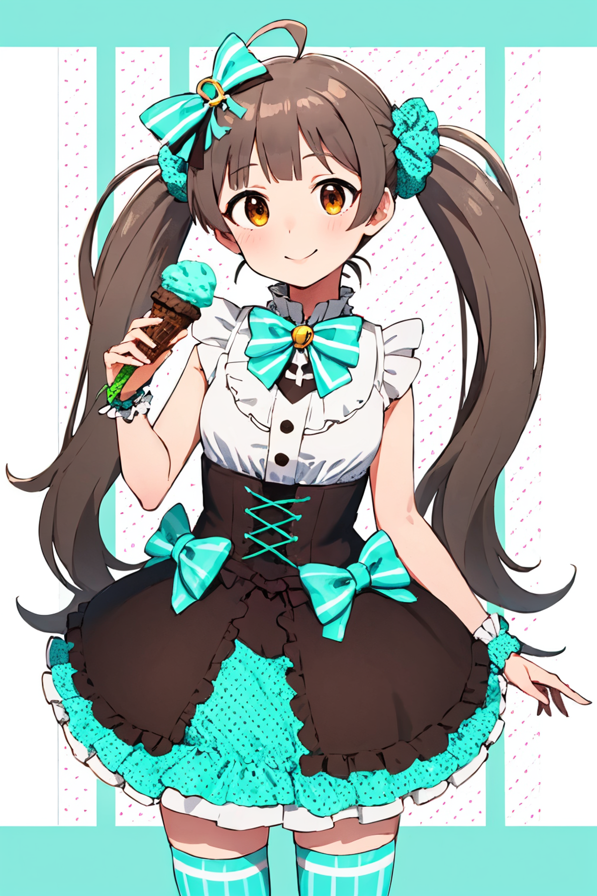 hakozaki serika, twintails, ahoge, girlish chocomint, sleeveless shirt, frilled shirt, white shirt, layered skirt, frilled skirt, polka dot skirt, vertical-striped thighhighs, aqua thighhighs, hair ornament, aqua bowtie, striped bowtie, aqua bow, striped bow, hair bow, polka dot bow, aqua scrunchie, hair scrunchie, wrist scrunchie, polka dot scrunchie, wrist cuffs, buttonsFancy Dreaming (Outfit name: Happiness Clover) / ファンシードリーミング (衣装名: ハピネスクローバー)