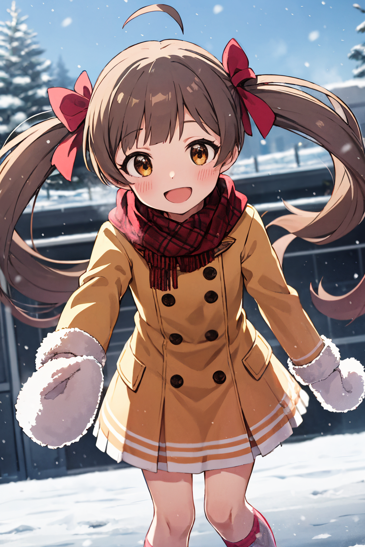 hakozaki serika, twintails, ahoge, little teacher, brown coat, double-breasted, winter coat, plaid scarf, red scarf, long sleeves, frilled skirt, pleated skirt, brown skirt, mittens, hair bow, red bow, argyle legwearPuka-puka Shark / ぷかぷかシャーク